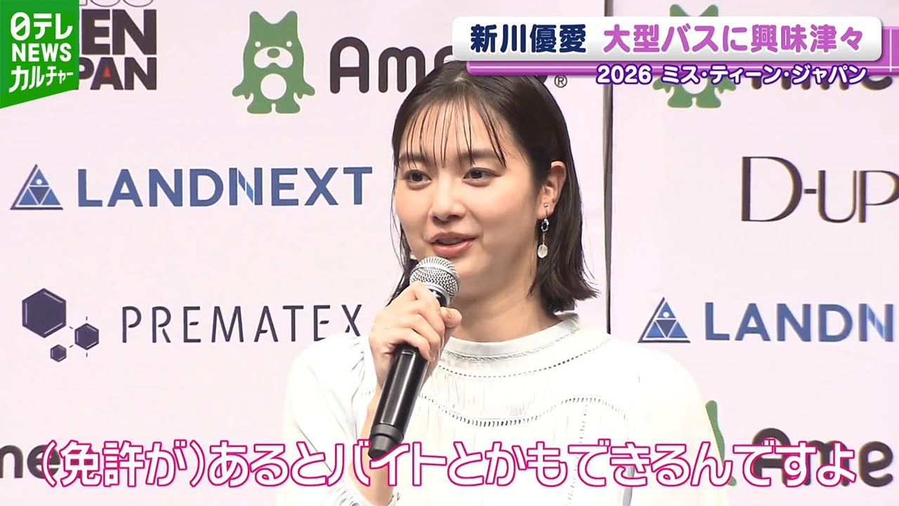 新川さんが登場したのは10代の ミスコンテストミスティンジャパンの開催 発表会です。平優さん、トラウデン直美 さんと共に応援アンバサダーを務める新川 さんは今年特別審査員にも初挑戦します 。 私はこの子がいいと思いますっていうのを、あの、毎年毎年あの裏でスタッフさんに言って私にやらせてくれないですかって去年今年じゃあやってみるって言っていただいて またロケバスの運転手と結婚したことで知られる新川さん今年取りたい資格があるそうで免 [音楽] 取って大型バスの 免許取ろうと思っててロケバス運転する 田さんに あるといやバイトとかもできるんですよ 十分今でも本当にご活躍だと思うんです。 でも運転することも好きなのでこのお仕事の人とあの皆さんの載せてお出かけもできたら嬉しいなと思いますしうん。 [音楽] いろんなことに、ま、その資格が使えるじゃないですけど、そういった意味で撮ってみたいなと思いました。 [音楽]