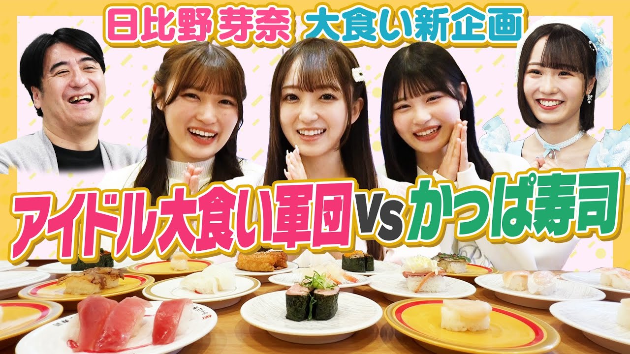 [音楽] マジかよ。 これはすごい。 過去最高に見応えのあるVR になってます。これはえ、食うじゃん。 ええ、す。 さあ、今回は日々の大食い企画に新展開。な んだろう?なんだろう? ラーメンじゃなくて新展開があるという風に聞いたんですが、 え、ちょっと日々野さんを中心に 大食いできるアイドルを集めたらどうなるのか見てみたくて あ、だから軍団にするってこと? 軍団にするっていう アイドル大食い軍団軍団 大食い軍団 だ。ところから来ていただいたっていうこと。日々の 私からスカウトしました。おえ、 裏の仕事してる。 裏が いや、面白いな。はい、じゃあ、日々のV フリお願いします。はい。VTR ヘイ。おまっちょ。 あ、おまっちょ。ちょだ。 大食いアイドル大決。 [音楽] イエー。これマジで。 [拍手] さあ、ということで、私今まで1 人で大食いをやってきたんですけども、あの、プロデューサーのさ磨信ゆさんからちょっとアドバイスをいただきまして、新たに大食いアイドル軍団としてチームを作った方がバグっと波とかに出やすいんじゃないかと ガシアドバイスをきまして、 よく食べるアイドルさんとして見たことがあったお 2 人をちょスカウトさせていただきました。 嬉しいです。ラーメの大食いはして アイドル大軍団も一緒に頑張っていこうかなていう。では そんなメンバーを紹介させていただきます。どうも私がリーダーの面で兄の担当のメナです。せーのメナ 気使わせちゃう。 はい。マイファブのみほりんこと田中みほです。過去に大食いはドーナツを 18個食べたことがあります。 よろしくお願いします。りパンパカパンパンパンダパンパカパンパンパンダ。あんたで言いたい。パンパンパンパンパンパンダ。 [音楽] 地上派で取り上げられてましたよね。 世界行点ニュースです。 れるぐらいのガチのガチを選ばさせていただきました。ちょっと本当に戦っていこうと一緒に。 はい。そしてはい。はい。 Pジアルの最年勝っぱ食べます。 みなみナです。よろしくお願いします。いいさそうだな。今はまだ終わらせない。今のマの自分を捨てて [音楽] かこにキング牛丼を トッピング6つつけてたことがあります。 すごすぎ。いや、そう。すごいあのX ですごいビジュアルのどんぶりを完食してるのをなんか平気で可愛い顔で乗せて これはすごいと思ってちょっと 使うさせていただきました。 私はそのラフラフさのメンバーの1 人松り涼ちゃんが高校の先輩です。 まさかの繋がり なのでり香子先輩頑張るよ。あ、 ということでアイドル大食い軍団今回第1 回目対戦するのが お寿司おになります。やった。 お寿司ね。楽しみ。 まだ人見知りんところがましょ。 はい。頑張っていきます。 もぐもぐもぐもぐ キン。 これだけ決めてたんだろうな。 決め打ち感がすごいわ。 おい、左は絶対反対してる。 絶対反対してる。 私最年長やばい。どうしよう。 すいません。お店ここです。 おおお。え、かっぱ寿司。 あ、 すごい。え、こんなチェーン点で大食やっていいんですか? チェーン点での大食いなんてもう完全に いや、もうりあった 始まっちゃってるじゃん。チーン店の大やってやり始めたら あんだ ということでやってきました。 かぱ寿司。イエ。 カぱ寿司でロケできるのすごい嬉しい。 今回その食べ放題が70 分間でラストオーダーが20 分前にお知らせがある。 金額が税4190円。うん。 だから何皿からもっと取れる。 ああ、確かに 結構食べないとで取れないんじゃないかなとか。 [音楽] お寿司だけでも種類が70 種類以上あって、 サイドメニューも出た後もまだまだたくさんあるからかなり幅広いメニューでしか 追加料金にアルコールも飲み放題とかあったりとかめちゃくちゃ楽しそうな食べ放題を うん。いいね。あ、これサモンアイン側。 あ、生エビ。お、めっちゃエビ。中 トロ私も。え、中トロ食べる人。はい。 はい。お手いる?あ、いります。 あ、ホタ。え、美味しそう。 エビ種類豊富。 どれぐらい食んだ?最初行っちゃいちゃう。 あ、早。 あ、エました。エ ビ、エビ。美味しそう。 そう。 おお。すごい。続わ。何だっけ? 確かに。そっか。 そっか。そっか。確かに。 ああ。タイ、タめっちゃ来た。 みんなでかいぞ。まず第1人が 届きました。 すごいさん すごいだ。 なんかお腹にさ、たまるとかそういうのじゃなくて、とりあえず今は はい。 食べたいものを一気に頼んだみたいな作戦で行きました。 はい。全然ここはまだ余裕だよ。 はい。全然余裕。 ではかっぱ寿司の食べ放題せーのイ エー。頑張ろう。頑張ろ。頑張ろ。 え、何から食べよう?さ、 お稲さんと食べよう。 うそう。そう。 綺麗に入った。き めちゃ食べ方。お、じゃあ私もタイだ。 あと絶対100皿行けます。 さすが強すぎる。ちゃん すごい。でも待って。 やり方気1回1回ドかすタイプ。 お寿司屋さんみたいな恥ずかしい。 [笑い] お寿司屋さんだ。本格的。 じゃあエビ大好きなエビいただきます。 うん。 これ。こ