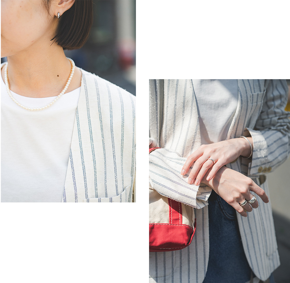 「甘辛なアイテムをミックスさせるのが好み。《CADEAUX(カドー)》の一連パールネックレスはコーディネートにレディな要素をほどよくプラスしてくれるので、ヘビーユースしています。手元のアクセサリーはシルバー派。かっこよくまとめてバランスを取るように意識しています。」