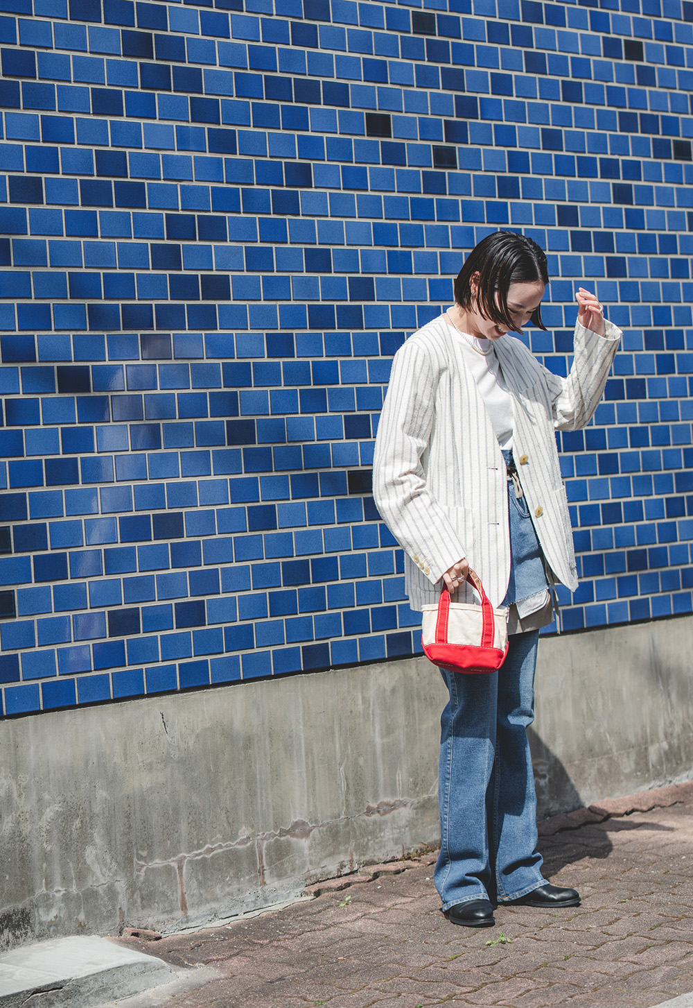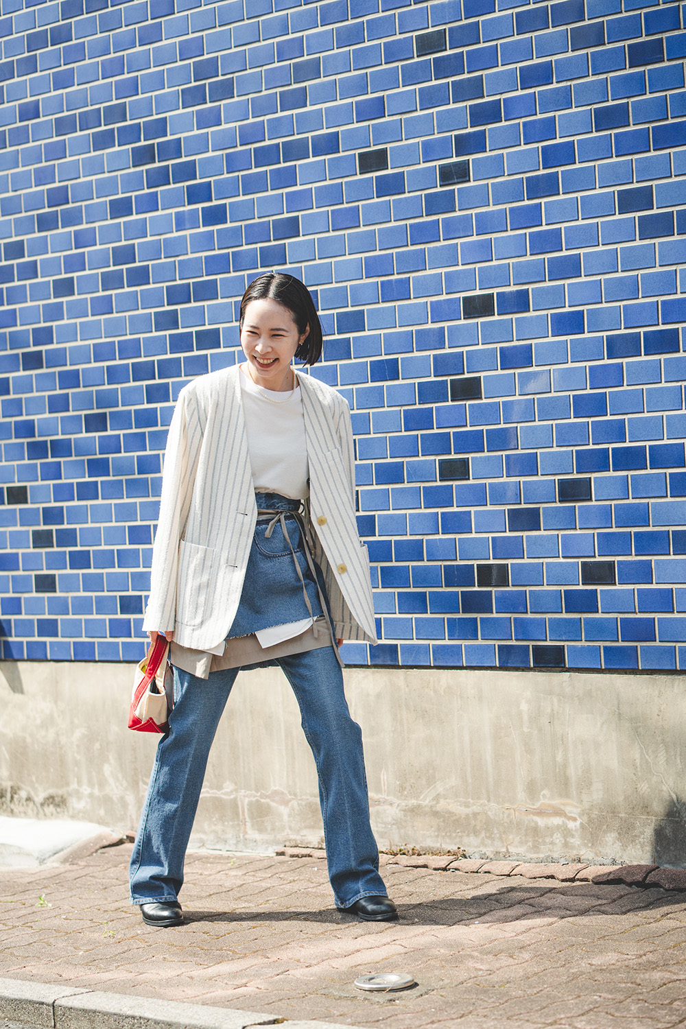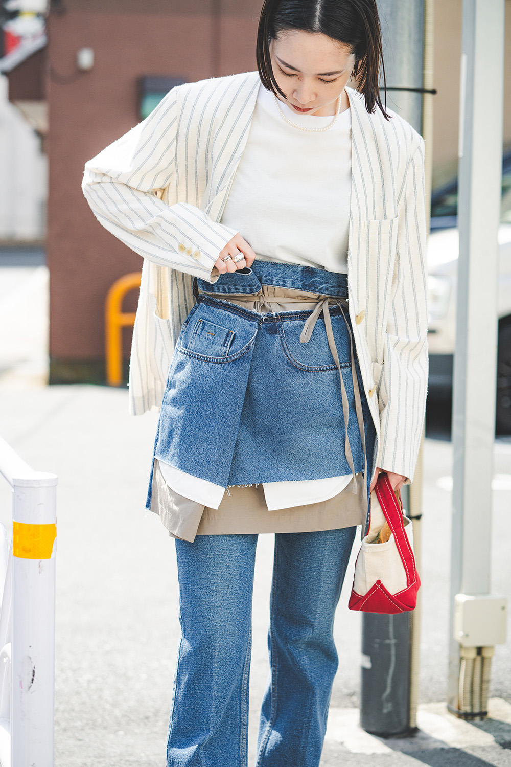 「手持ちのデニムアイテムはベーシックなものが多いのですが、この春は新鮮な着こなしに挑戦したくてデニムのミニスカートをチョイス。コーデに取り入れるだけでおしゃれに決まるエッジが効いたデザインのスカートはウクライナのデザイナーズブランド《LITKOVSKA(リトコフスカ)》のもの。《THE SHINZONE(ザ シンゾーン)》のフィット感のあるフレアシルエットのデニムパンツと重ねた時のバランスが気に入っています。デニムの色は同系色で統一感を出しつつ、トップスはホワイトにして爽やかな印象でまとめてみました。」