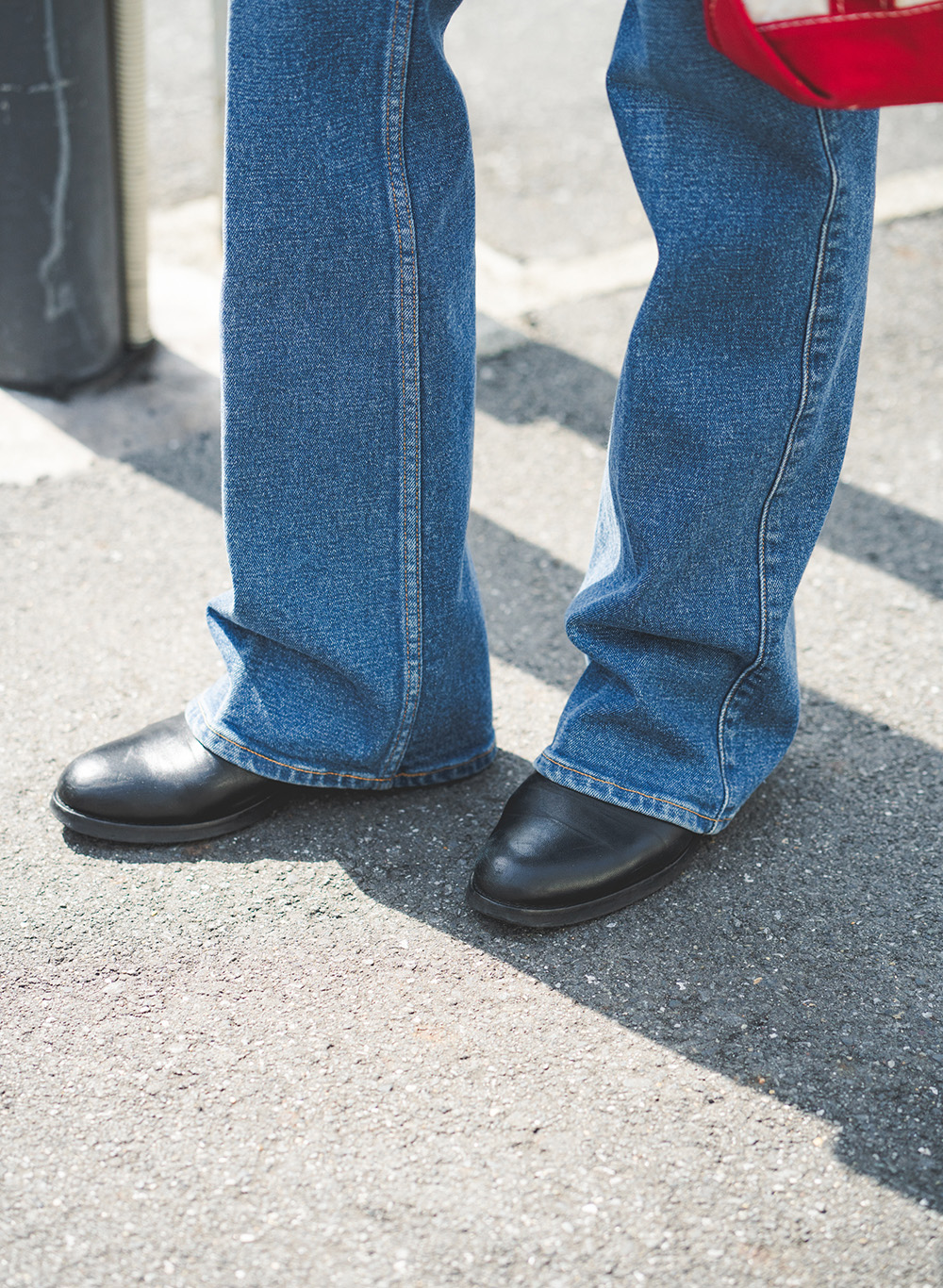 「足元はきちん感を大切にしたいので、敢えてスニーカーではなく黒のブーツを合わせました。デニムの裾のフレアとの相性もよくスタイルアップできるのもポイント!」