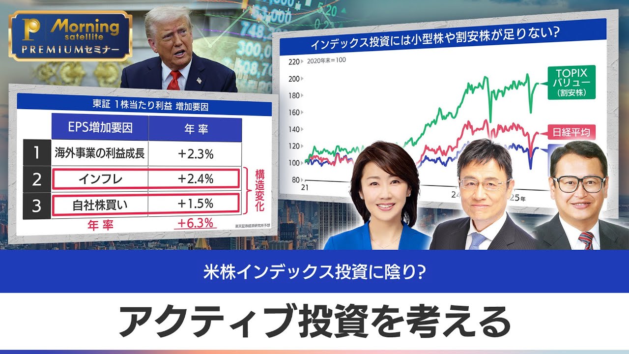 [音楽] こんばんは。申てプレミアムセミナーにご 参加いただきまして皆さん本当に ありがとうございます。テレビ東京佐々木 明子です。もうすでに多くの方に入って いただいておりましてSY73お番です。 期待してますですとかカスピ会カスピカ ヨーグルトの方こんばんは。よろしくお 願いします。どうもありがとうございます 。あのご期待ください。今日は本当に 楽しい内容でお送りしていきたいと思い ますが、ただ楽しくないのは相場です。 トランプ政権の完税政策の影響で動きの 激しい相場展開以前として続いていますね 。え、年来でおよそ、え、20%を下げる 場面がありまして、その後は戻ってきて- 6%の水準なんですが、今日の割値また 荒れまして 3万6985円となっています。え、 アメリカ株の方見ていきますと、SRP 500は年来で15%の下落。その後株価 大きく回復しまして年来の水準を上回り ました。ただ21日のアメリカ市場再び株 安権安ドル安のトリプル安に見舞われまし てS&P500再び年来マイナス権に沈ん でいます。で、ま、あの、去年から始まり ました新認者で投資デビューした人の中に はオルッカンやS&Pといった インデックス型の投資信託を中心に投資を していて、株価指数が暴落した時には資産 が元本割れしたという方もいたんではない でしょうか。え、そうした中で今日はこう した大幅なボラティリティを伴う相場でも 皆さんの資産を増やすためにその変化を、 え、ま、味方につけると言うんですかね。 アクティブ投資に目を向けていきたいと思っています。では今日のセミナーの講師早速ご紹介いたしましょう。大和証券のチーフテクニカルアナリスト県テーマリサーチ担当ストラテジストの木内二治さんです。よろしくお願いします。 こんばよろしくお願いします。 え、そして日本株のファンドマネージャー歴 25 年という経験を持つ楽天証券経済研究所のチーフストラテージ久保田正幸さんです。どうぞよろしくお願いいたします。 よろしくお願いします。 まず内さん、なんと言ってもまた相場がね、アメリカトリプルやに見舞われました。 そうですね。あの、これはですね、ちょっとトリプルアスでは見かけ上あるんですけども、あんまり心配しなくていいんだろうと僕は思ってます。 アメリカの金利も日本の金利も、えっと、ね、実は 5月の12日から30 年国際リ前とかってポコポコっと上がり始めたんですよ。 これ何の日かって言うと、あの米中が合意した合意した日 でそれからどうもこれ景気がいいぞっていう感じにもなってるんですよね。 はい。 いうにこれね、変わってくると思いますんで、これはね、もうちょっと時間、時間で消化できるものだと思いますね。 そうですか。はい。 久田さん、どうご覧になりますか? えっと、ま、ちょっとそのタイミングが色々あるとは思うんですけれども、え、私はちょっと目先は不安が蒸し返すかなと思ってるんですけど、 4月7 日ですね、え、トランプ関税の恐怖で暴落しましたけど、ま、あれはちょっと恐怖の行きすぎで、あの、最近 3万8000 円まで戻って、もうトランプ完税ックの、あの、起こる前のレンジに入ってしまったんですけど、これはちょっとあの、短期的に楽観しすぎていうことで、ま、今冷静に に不安と、え、ま、いい材料と考えながら、あの、少し、あの、不安をし返しながら、え、連を模索してく展開かなという風に思ってます。 そうですか。というようにもう本当にお2 人ともたくさんお話聞きたいことあるんですけれども、今日のテーマを早速皆さんにご紹介していきたいと思います。スケジュールを確認していきますと、まず第 1 部です。インデックス投資の先行きとアクティブ投資の味です。 ま、今後の株式相場全体の見通しを含めて なぜ今アクティブ投資に注目するのかを 詳しく聞いていきます。そして2部は アクティブ投資の選別癌を養うです。 アクティブ投資をする上で重要なポイント は何か?経験豊富な2人のベテラン講師が 独自視点を交えながら解説していきます。 そして3部は年後半に向けてのアクティブ 投資戦略です。今後の展開を踏まえて具体 的にどんなセクター銘柄に注目するべきな のかを考えていきます。そして最後は もちろん時間が許す限り皆さんからの質問 にもお答えしていきます。え、テレトビズ をご覧いただいてる申てプレミアム会員の 方は画面にチャット欄がありますので、え 、質問などどんどん書き込んでください。 トでご覧いただいてる方はチャット機能は ないんですけれども、画面上のQRコード から質問フォームが利用できます。また 妄察プレミ会員の方もご利用可能です。え 、質問フォームでの質問の受付はライブ 配信中となります 。さあ、それでは早速第1部インデックス 投資の先行きとアクティブ投資の明味に 入っていきましょう。まずは皆さんよくご 存知かもしれませんけれどもインデックス 投資とアクティブ投資についておさいをし ていきます。インデッ
