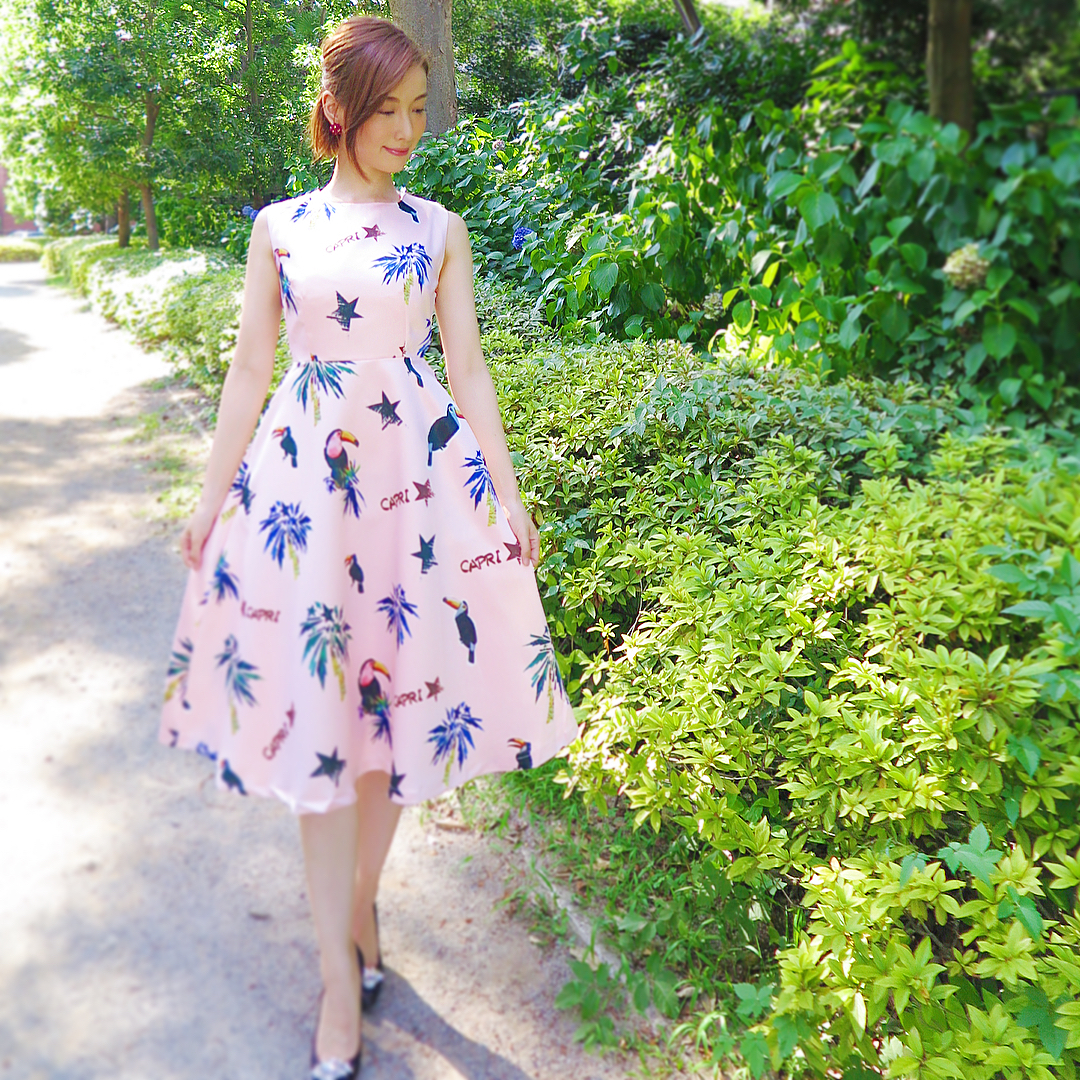 さて、こちらはカプリ柄のワンピース👗💘ヤシの木や🌴鳥のプリントで、爽やかな1枚です✨