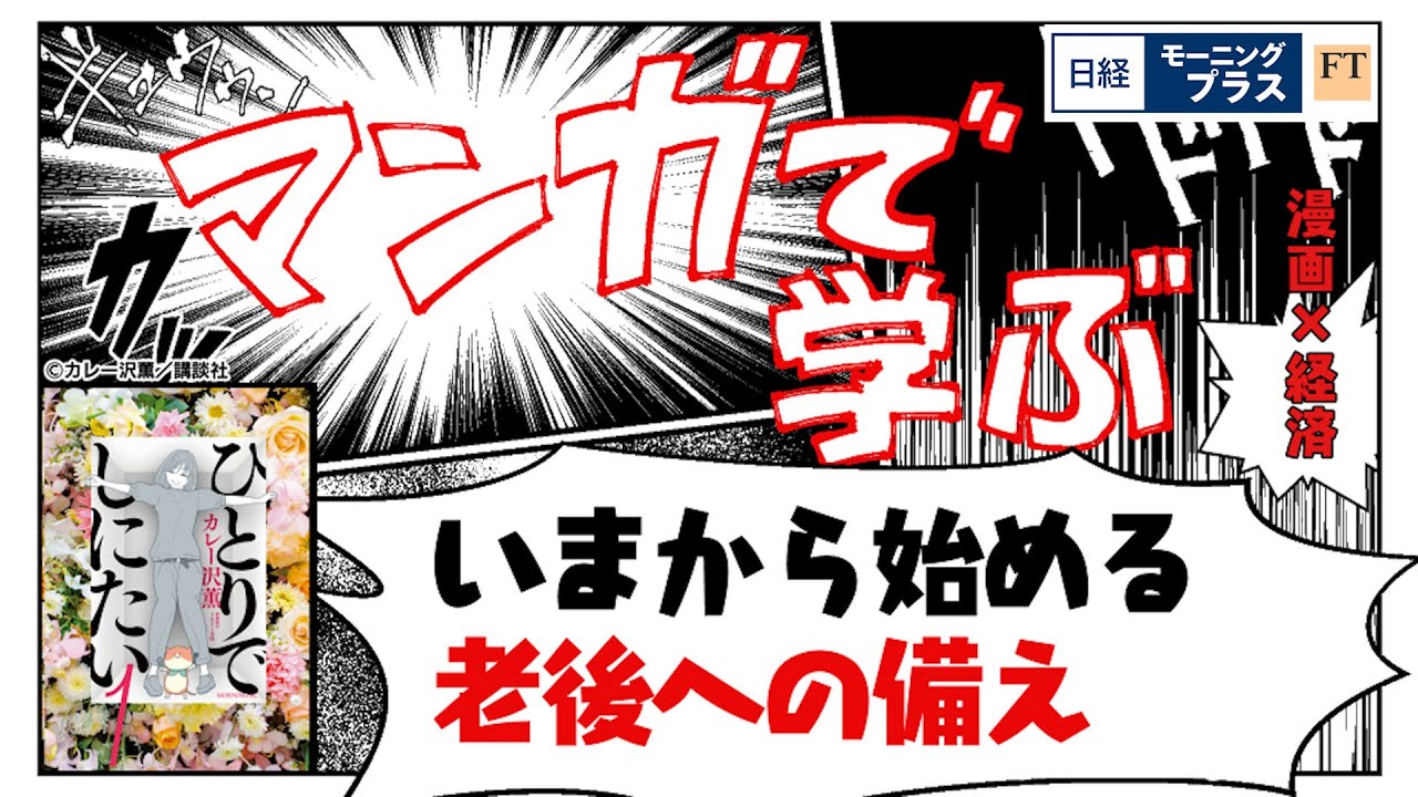 漫画を題材に経済や社会の知識を深める特集漫画で学ぶです。一緒にお送りするのは日経マネ編集委員の大口勝さんです。よろしくお願いいたします。 よろしくお願いします。 さて今日のテーマですが今から始める老語への備えです。取り上げるのはこちら。 1 人で死にたい。あの、ちょっとドキッとするタイトルですけれども、あの、作者はカレー沢おさん、原案協力がドネリーみさん、文化庁芸術祭の漫画部門の優秀を撮った作品で、来月には NHK でドラマカも予定されている注目作なんですよね。 なんかタイトル聞くとね、こう大変な漫画みたいな暗い漫画かななんて思うんですけども、主人公がこう前向きなキャラクターなんですよ。な もんですから、笑えるところも結構多い作品ですね。 うん。 で、バリバリのキャリア女性として働き、憧れだったおばさんが最後は孤独駆使してまったということをきっかけに主人公が自分の生き方を見直すっていう漫画なんですね。 そうですね。その主人公ですが美術館の学芸として働く 35 歳の独身女性です。孤独しないためにはまずは婚活だということで婚活を始めるんですが同僚に結婚すれば安心。 子供が面倒見てくれるは今時都市伝説だとまで言われてしまいます。そこで主人公はそれなら私は誰にも迷惑をかけないように自立した人間として 1人で生きて1 人で死にたいと決意するんですよね。 そうですね。主人公や同年代のにだけじゃなくて主人公の両親が熟年離婚を考える話があったりあるいは弟とそのお嫁さんとの確質などま、いろんな話が出てきますから幅広い人たちに刺さる作品になってると思うんですね。 それからあとあの老については例えば、え、住むところは高齢者マにするのか持ちがいいのか はい。年金はどうする?うん。 保険はどうする?ま、先に行ってあるは葬儀や墓はどうする?なんつって結構考えておくべきことがたくさんあるんですよね。 私もこの作品を通してそのことを改めて教えられました。 そうですよね。私も読ませていただいてタイトルこそ死にたいですけれども、そのためにどう生きるか必死に模索する姿本当にね、たくさん共感しました。 そう。はい。作者のカレー沢さんにも コメントいいています。作品を描く きっかけをお聞きしたところ、え、年々 増していく漠然とした不安に向き合う話に したら面白いのではないかということ。え 、孤独士就活をテーマにしたということ です。そしてどんな人に読んでほしいかと いう質問に対しては、え、今後死ぬ予定が ある人全員に見てほしいということで、 あの、全ての方に関係のあるお話なのでは ないかなと感じます。はい。そしてこちら のデータもご覧いただきたいんですが、 老後に不安を感じることの多くにお金の 問題が絡んでいるんですよね。え、年金 だけで生活できるのか不安ですとか、あの 、準備資金が足りるのかどうか不安など です。また不安に感じる人の割合も見て いきますと、男女別では女性の方が不安に 思っている人が多いんですね。 女性の方が比較的長息気だということに加えて賃金の男女格差というのも背景にあるのではないでしょうか。 はい。 ま、今あの老語についてどう考えですかって取材するともう 100人が100人ですね不安であると いう風に、ま、回答されるんですよね。 ええ。 ま、それであの働けなくなった後に生活が窮する老派 はい。ま、 これにならないようにするために、ま、どうすればいいかっていうのが大事なんですけど、その対策の 1つが、ま、投資ですよね。はい。 で、え、この作品では投資など資産形成の方法についてもかなり詳しく書かれていて読んでてあれ日けまかななんて思うぐらいな 時もあったんですが、 あのお金というのはとにかくあの物がないじゃないですか。 うん。 なので我々もあのお金の記事をよくまいるわけなんですがつもあのビジュアル化で苦労してるんですね。ところがこの作品ではま、コミカルな絵とかま、両親との面白い壁とかでそこをうまく表現されててこれ関心しましたね。 では漫画でどのように描かれているのか場面を 1 つご紹介します。投資を考えている主人公に対して同僚が簡単で少ない金額で始められてリスクも低いといでコを進める場面があります。ただで子にも注意しなければならない点として 60 歳まで速引き出すことができない。そして必要な時に解約はできないので余資金でやるべきだと説明しています。 まさにデコに限り限らず本当に分かりやすく勉強になるシーンが多くありました。 そうですね。もうで子に関してはこの通りです。はい。あの、ま、政府はね、元々年金だけで生活できますよなんてこと言ってないんですよ。だから 基本的には現役時代に自分で資産を増やしておくことが大事になるわけなんですが、ただこれってあの学校で教わるようなことでもないんですよね。 はえ。そうすると、ま、気がついた人から 順に気がついて実行していくってことし