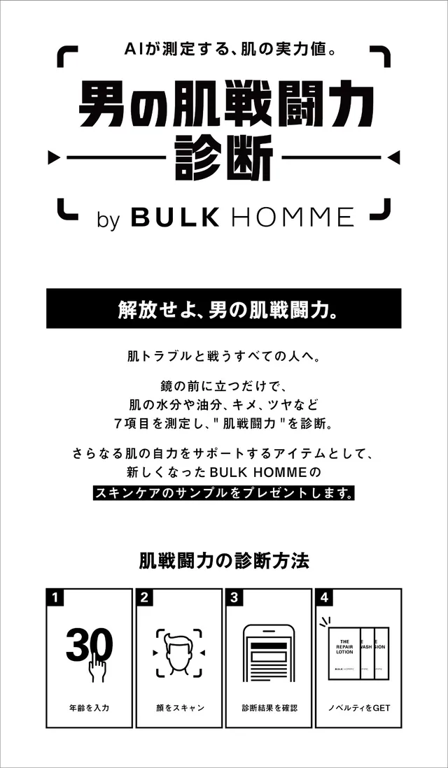 二つ目は、イベントの開催を記念した「開催記念キャンペーン」で、こちらは誰でも参加が可能。バルクオム公式Xアカウント(@BULKHOMME)をフォローし、対象となる投稿にハッシュタグ「#肌戦闘力診断」をつけて引用リポストすると、抽選で50名に美容液仕立ての薬用化粧水『THE REPAIR LOTION』が当たるチャンス。