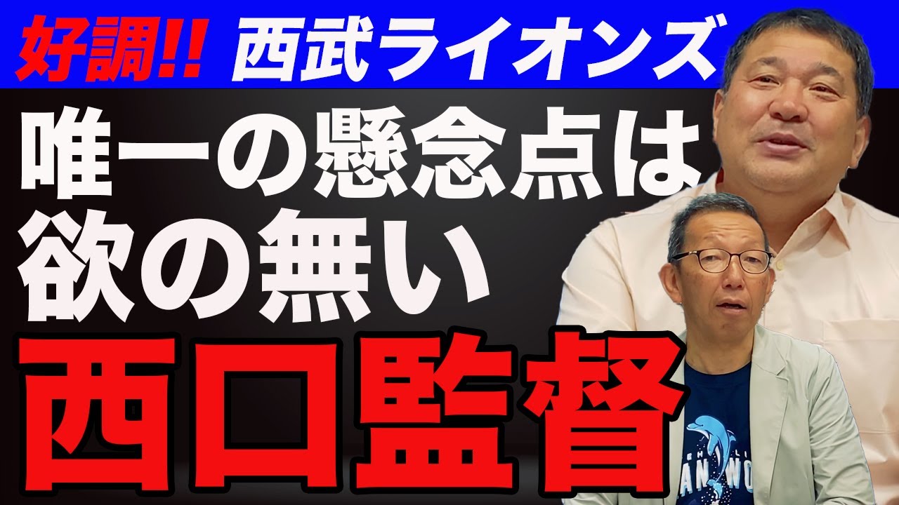 [音楽] [拍手] プロ野球も 2カードを迎えてAクラス、B クラスで少しずつこう差が出てきたかなっていうね、 状況になってきましたけども、ライオンズですね、最後。 はい。はい。 非常にここんとこ状態がね、良くなってきまして、で、昨年のどん底からね、もう今貯金が今日の段階で 4つですか?そうです。20勝到達ね。 20勝到達16 倍ということで、ま、非常に昨年とはね、まっきり違うチームになったようなね、 あの、ここまで、え、感じがしますし、で、若い選手たちもね、ツらとしたプレイが目立つし、ま、投陣はね、元々いいっていう評価をしてましたので、 ま、なんとか点を取れればっていうねことだったんですけど、非常にこう積極的にね、え、西口監督が、あ、選手たちをこう動かしながらね、 あの、いい野球ができてると思いますね。 YouTube の中でもね、伊藤さんは今年は去年とはもうガラっと変わるだろうってことはもう随分前におっしゃってたんですが、実際その通りになって当主人はもうローテーションちょっともう 余ってくるような感じでした ね。あの高橋今井住田それから菅井が渡辺がいてであの竹内が帰ってきたと竹内が帰ってきたの大きいですよね。 左1枚いると違いますよね。 ね。全く違いますよね。 ええ。 ま、これで先発時の層の厚さがより熱くなってきましたし、少しこう後ろがね、不安されてましたけど、平がしっかりとね、そこもカバーしてますし、 まあ、今のところ本当にしっかりと確立した野球がね、できてると思いますね。 あの、先ほど課題の打つっておっしゃったんですけれども、あの、 1 番に西川選手が入って、で、2 番に滝沢選手12 番がちょっとガラっとイメージ、これも変わりましたけども、 ま、今までもこう出てたことは出てたんですけど、ま、そういう人たちがやっぱりここに来てね、本当に自分らしさっていうかね、自分の持ってるものをこうゲームでこう出せるような環境ができてきたっていうのはも非常にね、セブらしい戦い方がこの先もやっぱりできると思いますしね。 [音楽] そうですね。 ま、それとあのルーキの渡辺選手、あの、これも YouTubeの中で伊藤さん随分 早い段階でこれはってことおっしゃってましたよね。 はい。実践タイプですよね。 はい。はい。はい。 ま、元々力はもちろんある選手ですけども、色々こう対応力があるっていうかね、そのピッチャーに応じたバッティングもできますし、なぜあの前向きっていうか姿勢がね、 常にこう攻撃的っていうか、 ええ、 ま、そういう姿がそのやっぱり周りに移りますんで、非常にこう影響力を持った 選手だと思いますね。 あの、昨日の時点で規定打席にも到達して、え、第 2 位に入ってきてるというんで、オールスターにも選ばれるかもしれない。 あ、もう今このままでしたらね、あとはですから 1 回ちょっと怪我してね、離脱しましたけど、ま、あとはそうですね、まだルーキーなのでこの 1 年間この野球をやってきたっていう環境がね、え、今までないので はい。ま、1 回怪我をしたことによって、ま、よりその辺も慎重になり、なおかつ代々にね、やって くれればいいと思いますし、ま、なぜこうやっぱ前向きの姿勢っていうのがやっぱ評価できると思いますね。え、え、ええ。 [音楽] ま、あの、首日本波もいよいよ伺うところまで来たんですけれども、 あの、西口新監督やっぱりこの主案っていうのもあるんですかね? ま、とにかく去年が去年だっただけにね、もうやっぱ思い切っていろんなことができると思うんですよね。 ま、あの、去年以上になることは絶対にないっていうところからですよね。 はい。ですから、まあ、ちょっと言い方悪いんですけど、失敗してもしょうがないと。 あ、むしろあの言い方もあれですけども、あそっからだと次の監督はやりやすい。 いや、そうですね。やっぱり引き受ける監督としてはね、もう上がり目しかないですから。 うん。いや、そうですね。そうです。 だから、ま、再開た、仮に再開になったとしてもね、そんなに批判はされないでしょうから。うん。うん。 ま、なんか今までとやっぱ違う形っていうかね、そういうものをやっぱファンの人たち、ま、我々も含めてね、 え、そういう目でやっぱ見てると思うので はい。 ま、ここに来て本当にあの、ま、人字もね、だいぶ変わって本当野球自体もなんかこう少し厳しさとかね、え、そういうものが要所要所にこう出てきてますんで、 [音楽] はるかにこうやっぱ違う野球はね、 やってるなって感じはしますね。 そうですね。西武ファンの方からすると 同じチームと思えないってくらいは、 大砲はね、やっぱりないんですけど、やっぱそれなりにどうやって点を取っていくかっていうのもね、え、すごく研究してね、実践できてると思います。 ま、本当あの選手たちがこう生き生きとしてやってるというかね。うん。だ、その辺も、ま、西口監督は、ま、 2 軍の監督も経験してますからね