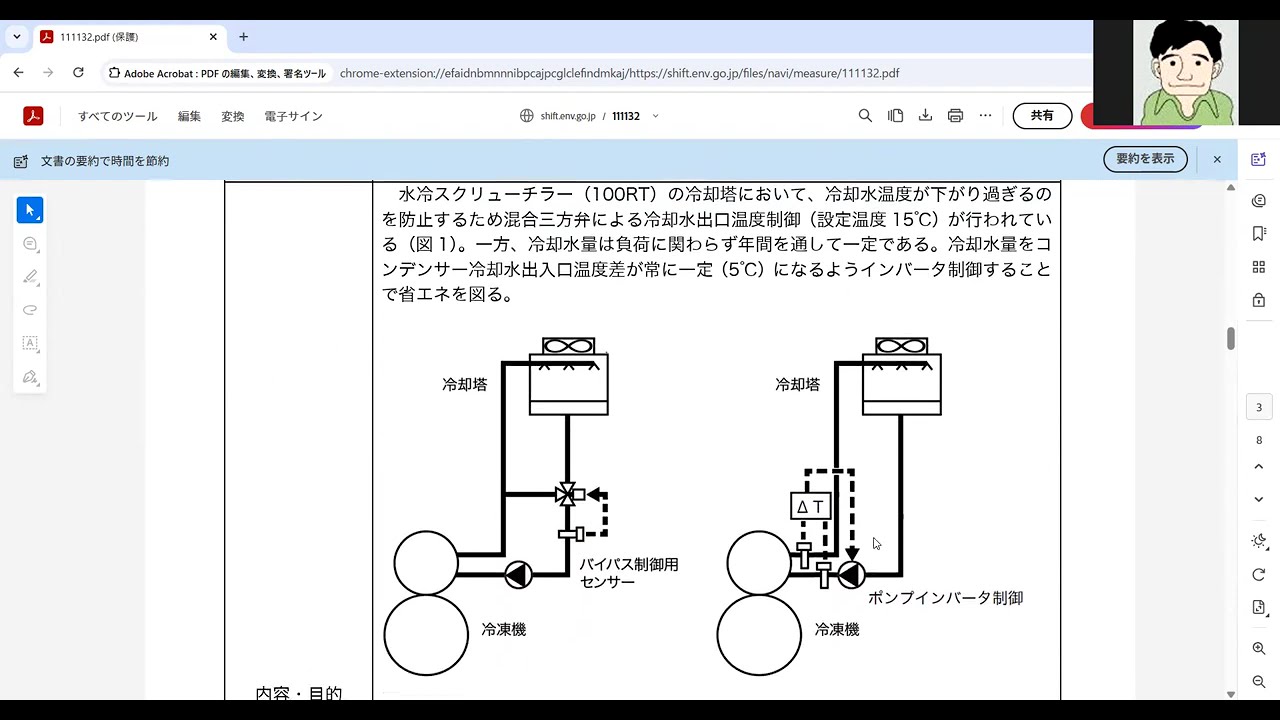 はい、それでは小エネ線勉強会はまた続け ていきます。ていうところで次がこの 11132の冷却水流量の適正とで冷却水 設定温度ってのと冷却水この2つがあり ますよって話になります。っていうところ で実際にじゃあ中身を見てみましょうって ところになるとま的には ま、ま、あの同じようなものになります。 っていうところでちょっと大きくし てで、ま、名称が冷却水流量の適正化と いう話で運用改善で産業用名を、ま、工場 でもビルでも使えます。で、なぜあの空調 システムなんで工場空調にも使えますと。 で、これ結構空調、工場空調にありそうな 機種でもあると言われます。手水冷チラー の冷却水温道保護制御で冷却等能力能力に 余剰が生じる中間機当期においてっていう 感じの この時にどういう風にまあするかってこと でオープンのインバーター制業を行いかと ま結構こっちの方が簡単かなていうような ところもあるしまこの辺はちょっとあの他 のせまあの接点温度の変更で、対応って いうのも当然ありるって感じです。手入れ チラーの冷却とにおいて温度が下がりすぎ て防止するため冷却水バイパス制限が行わ れているとこういう風になってますと。で 、一方冷却量は不可に関わらず年間を通し て一定であるっていうのがほとんどです。 ま、ほと、ま、だって、あの、 インバーターつけてまでとかで、ちょっと この時に必要になるの、確かに運用改善 って書いてあるんですけど、インバーター 機インバーターポンプでなければ インバーターつけないといけないという ことで、小額投資に、ま、なる場合がある かなっていうとこ。で、ま、本店は冷却 水量を負荷に合わせて減量し、ポンプ能力 を削減して障害を測るものであると 。空調負荷は季節により大きく変動する。 そのためチラー本体の消費エネルギー電力 やガスは中間機当期には大きく減少するが ポンプ保安等の大きい電力動力が年間を 通じて一定であるとこのためシステムの 総合効率が飲み悩むまこの総合効率の改善 っていうような結局その余力がある時に 余力を削るっていうま作業になるかなって 感じです。で、冷却等能力に余力が生じた 場合の省の対策とし て、ま、冷却水循環ポンプのインバーター 制限を行うとで、この場合も冷却水加減 温度は守らなけれもない。 冷却水入り口温度は下げられないで冷却水 流量の減少は血出口冷却水温度を 高め霊媒縮温度の上昇をもたらしチラの 性能に発させるとっていうところで まこの部分で そのま結果的にそのなんていうかその温度 が上がってしまうとま逆効果が発生するっ ていうこともあるって形ででポンプ能力の 減少とチラ本テのエネルギー消費量の増加 が消性能の観点でトレードオフの関係に あるので実施にあたって は詳細な検討が必要であていう風になって ますと。で、とこでこういう、ま、この辺 の概要シートについても、ま、全 あの、ま、その、ま、接点温度の話と、ま 、よく似たようなもんって感じな。で、 水冷式ま、ということで算定していい とで冷却灯で下がりすぎるのを防止する ため、まあ、設定 15°もこれ設定15°になってますんで 設定をさらに下げてこれ で、まあ常に1.5°になるインバット 制御でデルタTっていうか下げる温度 が5°になるように設定しますよと 。ここでここでの差 がっていうところで、例えば15° で冷却水 出口が15°が行われ て年間を通じていって冷却水ポンプ動力は 削減できる一方治らの消費電力が増加する トレード往復の関係にあるで左のように家 定する と4032°とすると冷却入り口の 32°負荷が40%で行うと39°と要請 をされる が で 非低下する。これによりチラのCOPが 向上し消費電力が減少する とで行動の違いでこういう風 にそして まデルタTが 5° 100%コ度が 42°冷却水量 制御で39 36°なすっていう風にちょっとこの辺の 中、あの、ま、分かってこの100%負荷 っていうのあると、あの、全力で動いてる 話なので、ちょっとこういう状態ではなく て、実際40% 程度で動いているのかなっていうような 感じので、220時間 78.1KWで冷却水1本容量がなるほと 。で、最初からずっと低角の 3インバーター ってところで、ま 、この辺の計算を行いますと。で、この辺 の条件は、ま、このまま、あの、ま、 コピーで使ってもそれまでだろうっていう ような条件に近いかなっていう感じがし ます。ってところで従来システムなし ありで新用ピン補正 値で集計結果の集計 とで3定 シートCP 24月録でCOP2がこれで、デルタtが 5度デタtがこういう状態でCOPがま、 ちょっと違いますよと。で、合計 がああってことですね。 ステで191でちょっと増えますよと。で 、 11.3+ 60PC 1PC1っていうか7.5kgなの で 7.5PP1や。PPPP1ですね。で、 PP2の計算はここにあるけど、PP1が 7.5で固定なので、そのまま計算されて るっていう 状況でっていうところ で60で、ま、これだけの差があります と結局この動力多少上がるけど上がった 以上に下がるというような決算になって こ