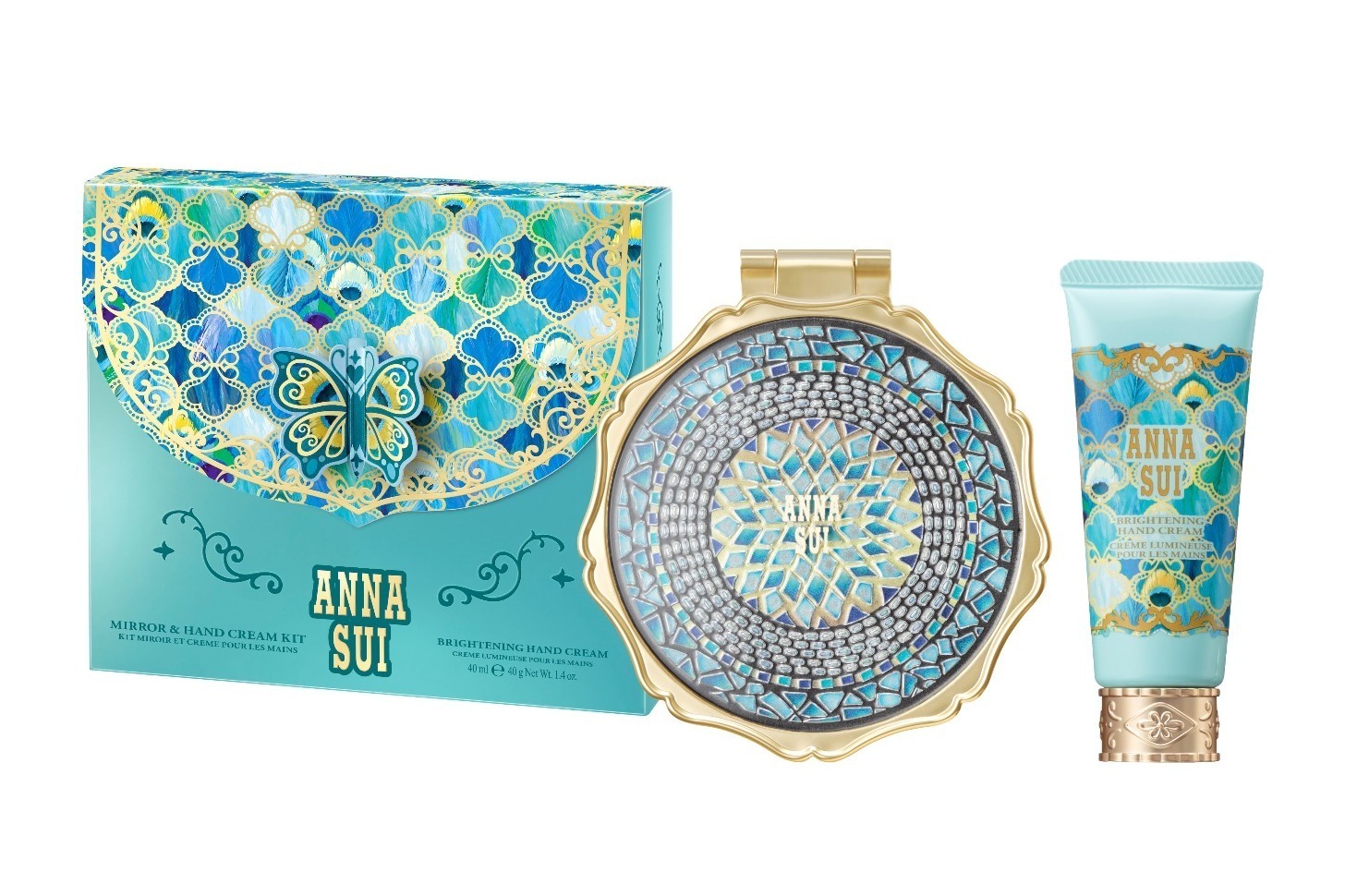アナ スイの新作は、“孔雀”を思わせる幻想的なデザインのコスメキット。蝶が羽ばたくブルーのボックスの中に、クリスタル風のモザイクをあしらったミラーとハンドクリームを詰め合わせた。