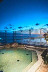 海風を感じながら、朝日に光る水面や刻々と表情を変えてゆく風景を眺められる露天風呂。「もし時間がなければ足湯だけでもOK。温泉のお湯を額につけるだけでも全身に良いエネルギーが巡る効果があると言われています」(青木さん)
