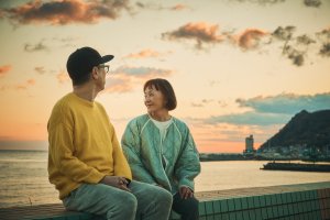 “鼻から吸って口から吐く”呼吸法を意識して30分〜1時間程のコースをパワーウォーキングする「現代湯治ウォーク」は朝食前や食事後、出発前に身体を温め、健やかな一日を迎えるためのアクティビティ。朝日スポットの高台にあるお寺へ向かう途中、伊東オレンジビーチでひと休みするおふたり。