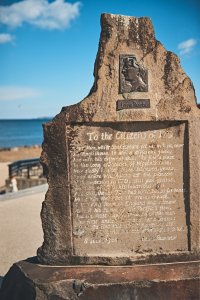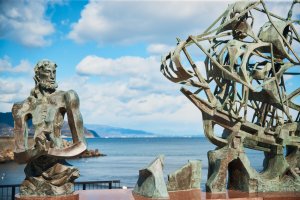 三浦按針の功績を讃え、後世に伝える記念碑や彫刻作品が点在する「なぎさ公園」。青空の下、開放感あふれる野外美術館のような心地よさ。