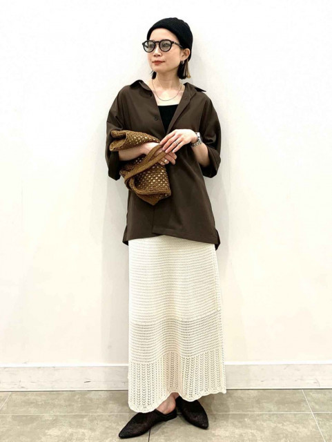 カジュアルな雰囲気のニットスカートは、ほんのりと透け感のある編み地が繊細な雰囲気をプラス。トレンドカラーであるブラウンのシャツを投入すれば、メリハリのある大人っぽい着こなしに。ラフなオーバーサイズのシャツが、こなれ感を演出します。デコルテが強調されるタンクトップでヘルシーに肌見せをして、顔まわりに抜け感をプラスすると◎