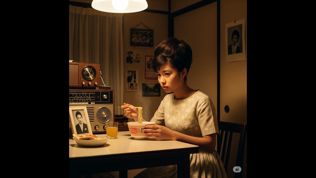昭和のラジオ深夜放送 真夜中のインスタントラーメンと 受験勉強する昭和のアイドルたち 深夜のアパートで、私だけの時間 曲 真夜中のインスタントラーメン 昭和レトロガール 秋山ポプラ