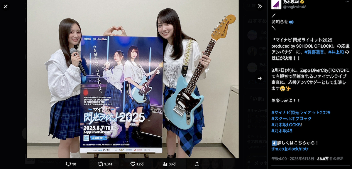 「マイナビ 閃光ライオット2025 produced by SCHOOL OF LOCK!」の応援アンバサダーに、#賀喜遥香、#井上和 の就任が決定!!