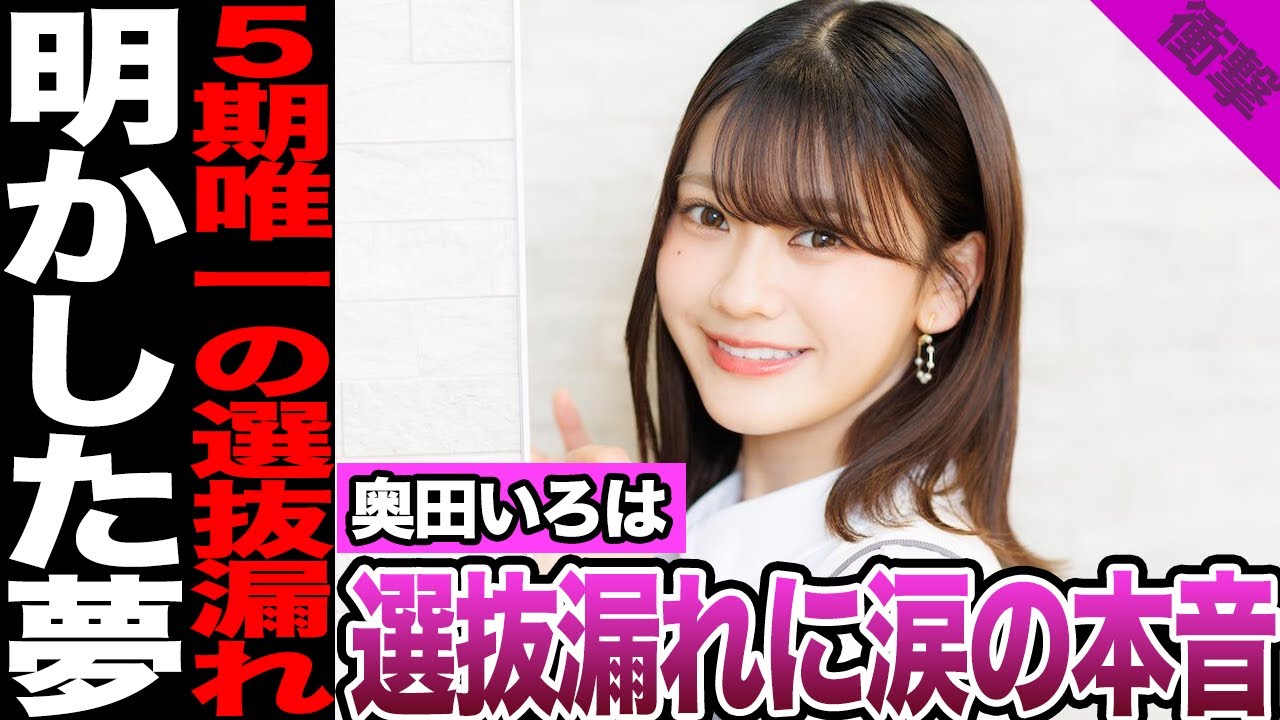 皆さんこんにちは乃木坂46の39枚目 シングルセムナンバーズの選抜メンバーが 発表されこの発表においてご規制の奥田色 さんが5期生の中で唯一選抜から漏れる 結果となりファンの間に驚きと衝撃が 広がりました奥田さん本人はブログで心境 を赤らに綴りその内容が涙を誘うと大きな 話題になっています今回は奥田色さんの 選抜漏れについてこれまでの歩みや本人の コメントファンの反応についてご紹介し ます是非最後までご覧ください ハイパー対応 乃木坂46の最新シングルセムナンバーズ の選抜メンバー発表は2025年6月15 日に放送されたグループの冠り番組乃木坂 工事中内で行われました選抜メンバーは 前作より減って16人となりその中心には 4期生の柿はかさんが選ばれていますまた 今回のフォーメーションにはご規制が一気 に10人も名を貫らねグループの世代交代 を感じさせる夫人となりましたしかしその 一方でご規制11人のうち奥田色さん1人 だけが選抜を逃す形となりファンからなぜ 奥田だけがという驚きの声が上がりました 運営サイドは限られた枠の中でベストな メンバーを選出したと見られますがこの5 期生全員選抜に1人だけ届かなかった現実 に多くのファンが衝撃を受けたのも事実 です実はこの結果についてネット上では 早くからある噂が取りたされてもいました それは5期生岡本ひなさんの初選抜は奥田 色さんと入れ替わる形になるというもの です今回まさに岡本さんが初めて選抜入り し代わりに奥田さんがアンダーメンバーと なったことで5期生全員選抜は実現せず この噂通りの展開にやはりそう来たかと 感じたファンもいれば1人だけ外すやり方 はさすがに酷ではないかという声も参権さ れました実際選抜枠を16人に絞ったこと で前作から3人間の構成となり4期生の 田村まゆさん神奈川さやさんはル奈さんも 選抜から漏れる形となっています ハイパー対応 ここで奥田さんがどんなメンバーなのかを おさいしていきます19歳の奥田さんは 2022年加入のご規生の1人で持ち前の 明るさとギター演奏など多彩な才能で注目 を集めてきました加入から約2年間は主に アンダーで活動し地道に経験を積んできた 苦労人ですしかしその間も着実に投格を 表し2024年末の36枚目シングル期間 ではアンダーライブ公園でセンターを務め として牽引していました当時からご規制 ながら堂々たるリーダーシップと評価され アンダーライブでの存在感はファンの間で も高く評価されていましたさらに奥田さん は舞台女優としても才能を発揮しています 2024年にはミュージカルロミオ& ジュリエットでヒロインのジュリエット役 に抜擢されその高い演技力と吸収力が共演 者からも絶賛されましたまた2025年春 には舞台1789バスティの恋人たちにも 挑戦しておりグループ外の活動でも着実に 経験を重ねていますこうした努力の成果も あってか2025年に入ってからの37枚 目シングル歩道で初めて選抜メンバーに大 抜擢続く38枚目シングルネーブル オレンジでも2作連続で選抜入りを果たし 一躍5期生の中でも選抜常連の仲間入りを 期待される存在でした39枚目選抜発表後 奥田さんは6月16日夜に公式ブログを 更新タイトルは強くなる強くなる自身の 言葉で率直な思いを伝えそのタイトルが 示す通り強くなる強くなると何度も自分に 言い聞かせるようなその文章からは悔しさ と前向きな決意がひしひしと伝わってき ますブログによれば発表当日の番組収録後 奥田さんは他のメンバーに気まずい思いを させないよう足早に会議室を後にし1人で キ路に着いたと言います駅に向かうまでは 耐えたのに電車に乗ってから色々考えて たら涙が止まらなくなってしまってと綴ら れており帰りの電車内でこえきれずに涙が 溢れたことを明かしていますその後これ までどんな時も1人で感情を処理してきた 奥田さんが今回ばかりは1人でいたら おかしくなると感じ実家に帰り乃木坂に 入って初めて家族にしんどい苦しいと弱 を漏らしたとも綴っていますそしてブログ の中盤では奥田さんの口からある夢が語ら れました私は1つ乃木坂にいるうちに叶え られたら嬉しい目標がありますと切り出し ご規生みんなで選抜に入ることですと宣言 したのですご規生11人全員で選抜する ことそれこそ彼女が心から望み大好きで大 尊敬している同期メンバーたちと一緒に 頑張りたいという夢だそうですしかし現実 には今回私だけ叶わなかったと悔しさを にませつつもでもいつか絶対叶いますよう に頑張りますと前を向く決意も綴られてい ましたこの奥田さんのブログ公開直後から ファンの間では大きな反響が巻き起こり ましたSNS上では読んでいたら胸が 締めつけられて涙が出た 正常直すぎる気持ちに心たれたといった声がいい継ぎ彼女の率直な告白に多くの人が心を動かされたようです頭では分かっていても選ばれない自分は不要なのかと感じてしまうかもしれない 想像を絶する悔しさと辛さがあったと思う とさんの心情に寄り添うコメントや涙を 流し