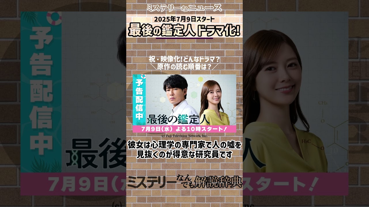 科学の力で真実を暴く新たなサイエンス ミステリーだ誕生最後の鑑定人が2025 年7月9日毎週水曜夜10時からテレビ系 で連続ドラマ化されます科学の力で人間の 嘘と事件の真層に迫る本格サイエンス ミステリーです主人公はどのこと科学捜査 の最後のトリドとして最後の鑑定人と呼ば れていましたがある事件をきっかけに仮想 権を退職現在は自ら解説した土門観転者を 営んでいますドラマで主演を務めるのは 俳優デビュー30周年を迎える富士さん そんなどを支えるバディとなるのは白石 演じる高倉彼女は心理学の専門家で人の嘘 を見抜くのは得意な研究員です2人の元に は操作に行き詰まった警察関係者や司法 関係者から解決困難な依頼が舞い込みます 検索は小説家祝井慶の透明小説最後の鑑定 人です科学的鑑定をテーマにした本格派で ありながら登場人物の人間ドラマにも深く 切り込む構成が特徴です原作小説は最後の 鑑定人だけではなく続編にあたる仮想県の 砦出も出版されています自系列は仮想県の 鳥で最後の鑑定人の順番ですが最後の鑑定 人から読んでも問題ありませんドラマは7 月9日放送予定です楽しみですね