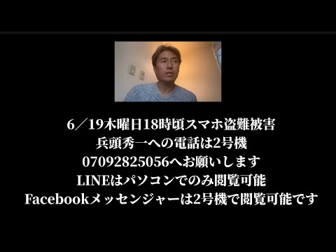 ソールメイトの皆さんおはようございます 兵道週一知です6月20日 金曜日 朝10時になります え関係者の方に緊急のお知らせいません スマホを実は噴失してしまいましたえと いうか厳滅にはちょっと目を離した隙に 持ち去られてしまいました今JR 駅近くのビジネスホテルにおりますがえ1 情報確認で2つ隣の大梅駅でえそのスマホ の存在が確認できていますがえは探し出す のが不可能な状況です交板にもJRにも 届けがありませんえ私は昨日大駅周辺に 行ってないのでもまそれ情報が間違って なければ持ち去られたということは確定え 悪意ある人に持さられたということが確定 的な状況ですでえ 2号機3号機は常に持ち歩いているのでえ 私への連絡は2号機 07092825056 えお願いいたしますというお知らせで ございますすいませんメディアの方とか 関係者の方070あこれあの字幕で表示し ます070928250 このスマホは持ち歩いておりますちょっと お金とかもあって大変だったんですけど実 は車の中にたまたま少しのお金がありまし てホテル止まれるぐらいのお金がありまし てでま車免許処もあったんで車移動でき なくてえ駐車販切ッ符切られるという2次 災害まで起きてしまいましたがまめげずに 頑張りたいと思い ますえ午後昼頃免許所を持ってる ボランティアさんが来てくれるのでえその 方に車を 動かしてもらう予定いいです今日は JR従って今日はJR駅前でえ午後昼昼 ぐらいからできますかねもうずっと夜8時 までギター引き続けたいと思いますの 手続きとは後回し選挙期間中う時間との 戦いなので っていう状況ですねえっとパソコンは持っ てきてるのでLINEや選挙comは パソコンでできますスマホは2号機3号機 持ってますの3号機あんまり使わないん ですけど2号機を持っておりますとです から1号機が噴出して えー ちょっと財布も兼ねたスマホだったので 偉いになってるという状況でございますえ 今収録しているのは2号機のカメラで ございます070928250 えどこまであの関係者の方に伝わるか 分かりませんが お知らせでございましたありがとうござい ましたどうぞよろしくお願いします