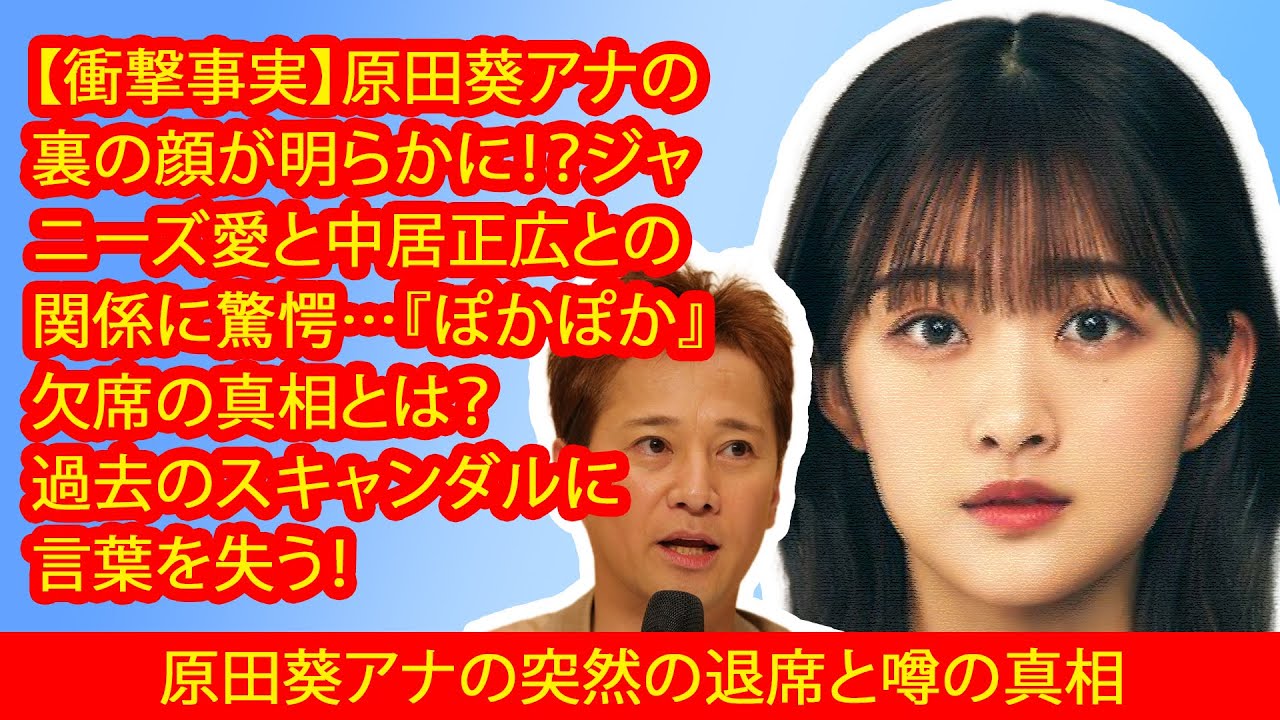最近の『ぽかぽか』生放送中、原田葵アナの突然の退席が話題になっています。「大丈夫なの?」と心配する声がネット上で上がり、一部では中居正広さんとの関係や「妊娠スキャンダル」といった憶測も飛び交っています。この動画では、原田アナの体調不良の真相や、どのようにしてこれらの疑惑が生まれたのかを詳しく解説します。また、ネット上の噂や情報の背景についても触れ、視聴者の皆さんが知りたいことを整理します。原田葵アナの今後の健康を願いながら、ぜひこの動画をお楽しみください!#原田葵 #ぽかぽか #中居正広 #噂の真相