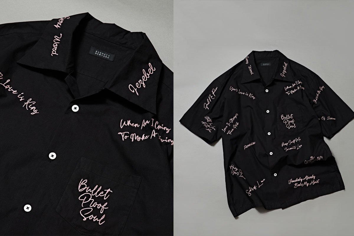 生地に間隔を開けながら、楽曲名を一針ずつ丁寧に総刺繍でほどこすという、時間と労力を惜しまない製法により、着る者の感性を刺激するクラフツマンシップが体現されたコットンアロハシャツ。