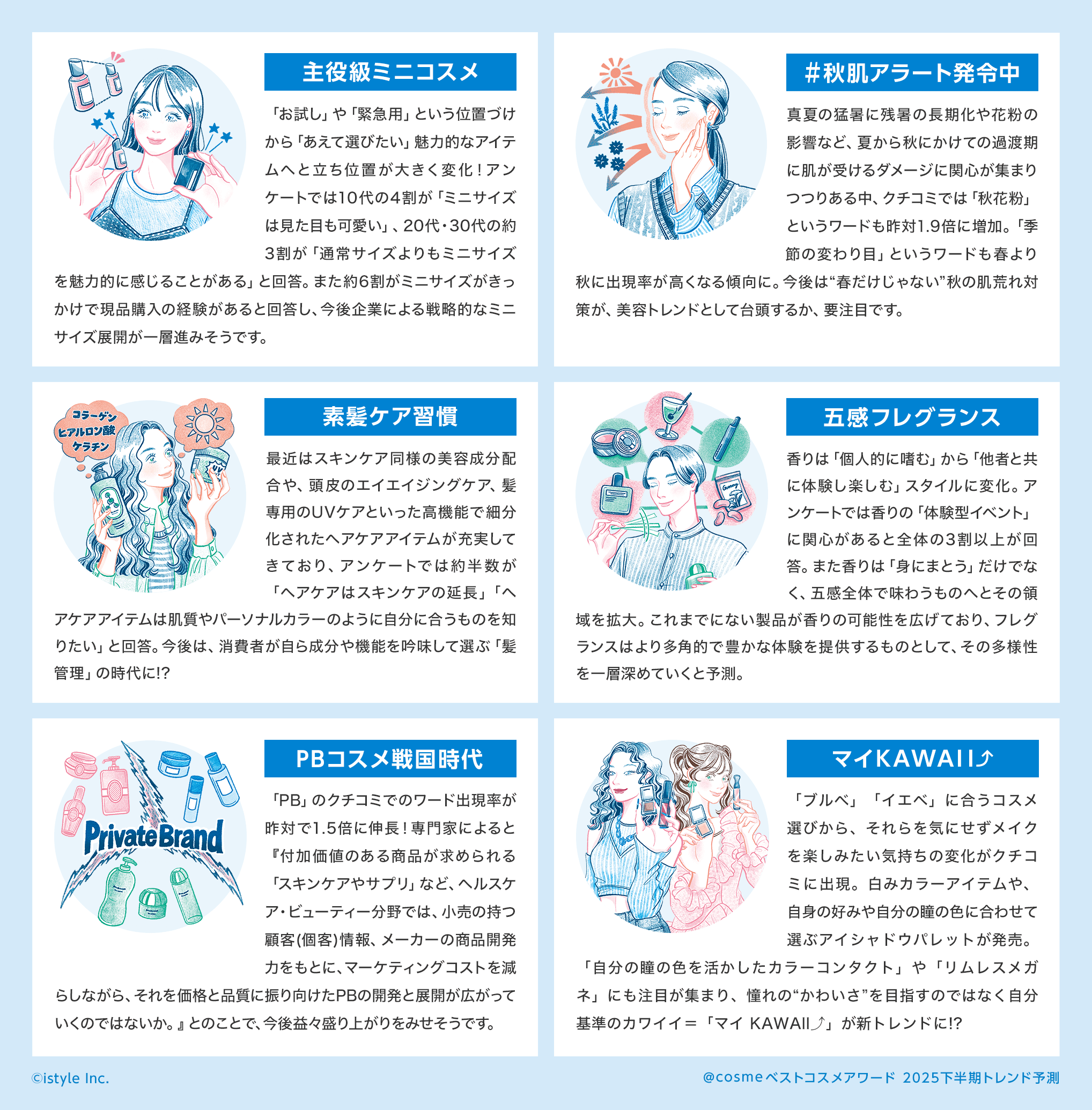 コスメ・美容の総合サイト「アットコスメ」を運営するアイスタイルが、2025年の下半期トレンド「@cosmeベストコスメアワード2025下半期トレンド予測」を発表した。アットコスメに投稿されたクチコミや、同社が運営する実店舗での売り上げの分析、ユーザーアンケートなどから6つのトレンドを予測しキーワード化した。