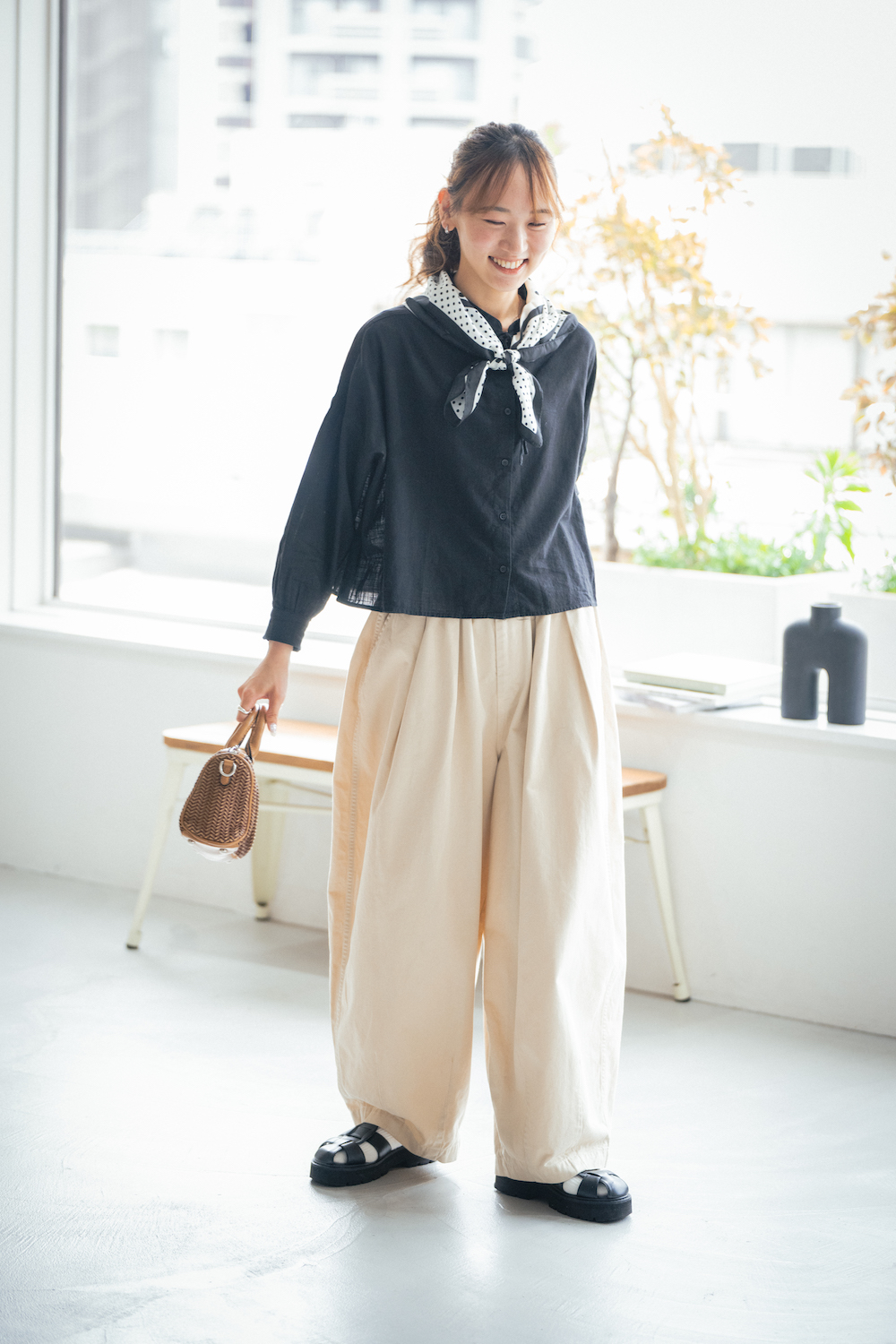 彼女は最近、黒ブラウス×ベージュパンツのコーディネートをよく着ているそう。マイブームだというドット柄スカーフが、ボリューム感のあるバルーンシルエットのパンツのムードとリンクして、大人かわいい雰囲気に。「カゴバッグを持つと、とたんに初夏のムードが高まるので、みんなも試してみて!」