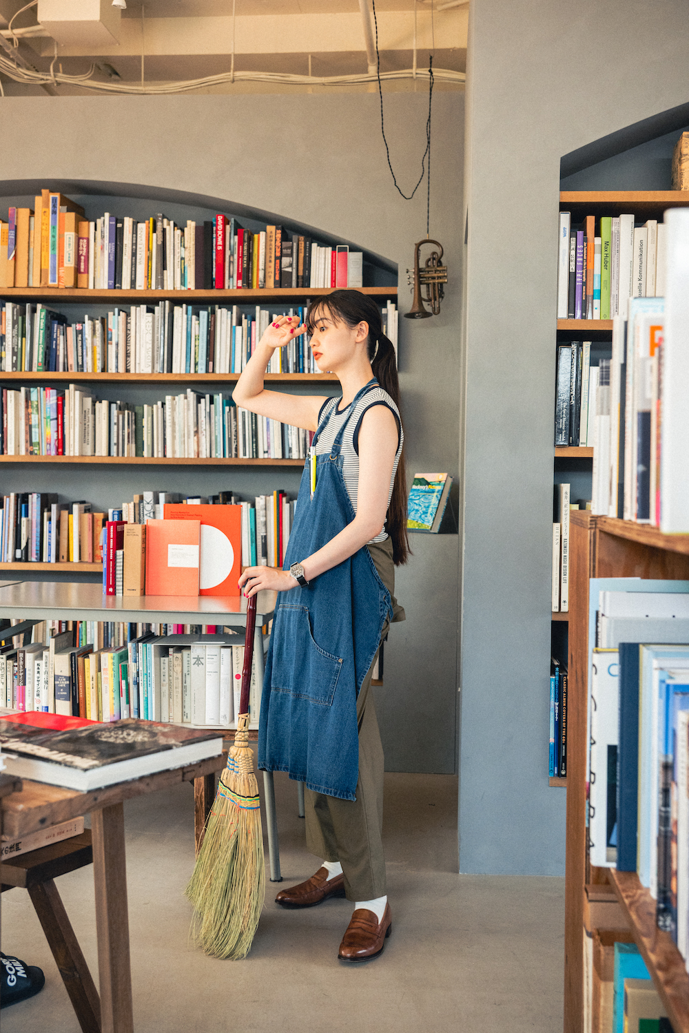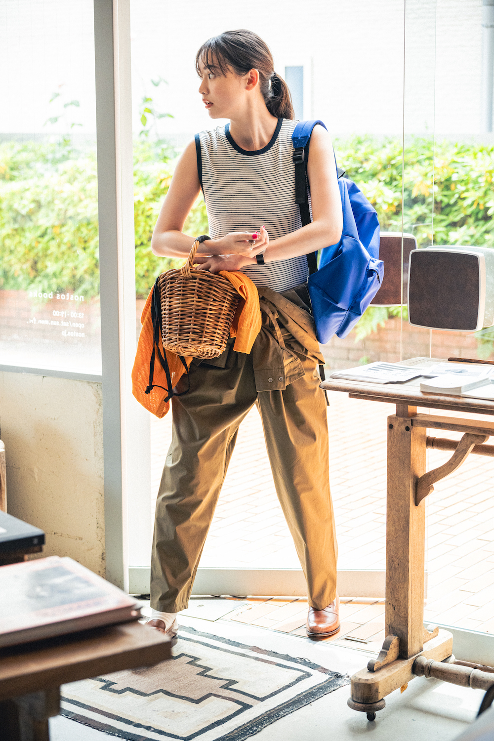 今日は本屋でお仕事。出勤してまずはお掃除から。ジャンプスーツの袖部分を腰に巻くアレンジ術は、簡単なのにこなれ感が漂うし、夜風や冷房などで寒いと感じた時はいつも通り袖を通せば体温調節もできておすすめです。真夏はボーダーのノースリーブと一緒に、ヘルシーに着こなしましょう。時計やカゴバッグで品を添えて。