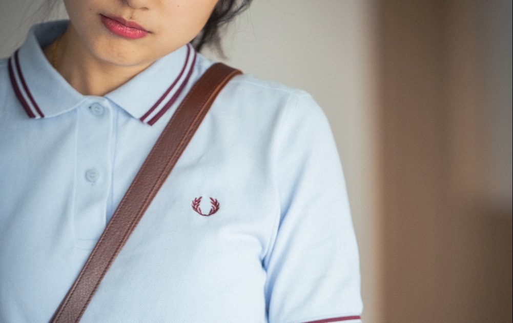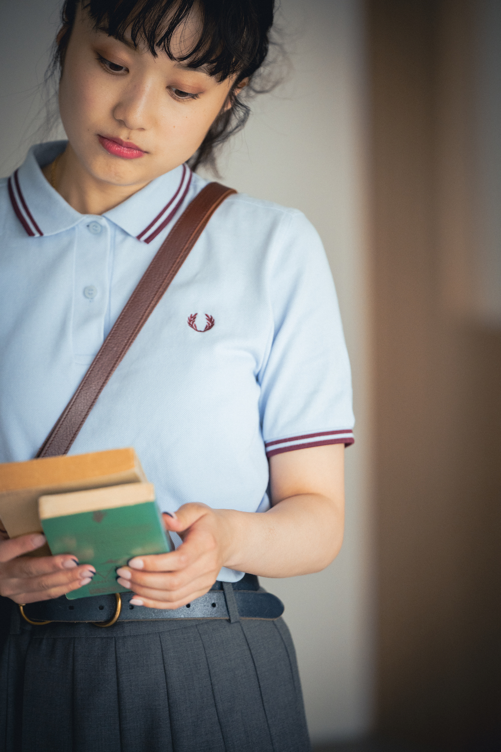 「ポロシャツ×プリーツスカートのマイ定番コーディネート。ポロシャツのボタンをすべて留めることで、かっちり感とトラッドな雰囲気をプラスしました。淡いブルーの《フレッドペリー》のポロシャツは襟元と袖口のボルドーのラインがお気に入り。大人っぽさと可愛らしさのバランスが絶妙で、ベーシックの格上げに重宝♡」