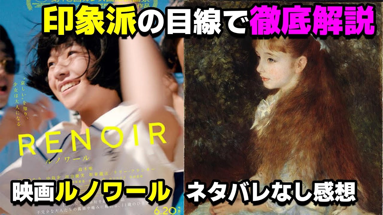 どうも裏切りです。ということで今回ご 紹介する映画は早川知恵監督の最新作国際 映画祭にも出品されましたこちらの映画 ルノワールの感想を喋っていきたいと思い ます。え、なお今回はネタバレなしの映画 感想動画になります。え、アすにつきまし ては概要欄の方に記載してありますので そちらからご確認いただければ幸いです。 この映画のタイトルにもなっている ルノワール。え、これ元ネタになっている のは19世紀後半に活躍した、え、 フランスの印象派と呼ばれるグループに 属していた画家オーギュストルノワールの 名前を撮っているんですけれども、やはり この印象派と呼ばれている画家たち、え、 彼らに言及した上でですね、この映画に ついて触れていかざるを得ないかなという 風に思っておりますので、え、その印象派 と呼ばれていた画家たちについての解説も 含んだそういった動画になっております。 ということで、どうか1つ、え、最後まで ご視聴いただけますと幸いです。よろしく お願いします。 というわけで最初はですね、率直な映画の 感想から喋っていきたいと思うんです けれども、え、一言で言ってしまうとこの ルノワール非常に興味深い映画でした。 この映画はですね、面白い、面白くない そういった言論で考える映画ではないと私 は思いましたね。うん。早川知恵監督ね、 あの前作のプラン75を私映画館で見た時 にいやすげえSFAが撮ったなって思った んですよね。日本を舞台にあのクオリティ のあのリアリティある映画SF映画を取 るっていうのはこれはすごいなと非常に 余白のある映画を作る監督ですよね。ま、 多くを語らない監督ですよね。セリフの数 っていうのもすごく少ないし、やっぱり 映像で物語の展開を見せていく映像ですと か、ま、あと役者の演技、目線、あとは光 の演出、こういったもので物語をですね、 推進させていくっていう。まあ、だから 普通にボケと見ているだけでは絶対に早川 千恵監督の映画っていうものは理解でき ないですよね。あの、余白があるってこ 悪い言い方をするとスカスカに見え るっていうことかもしれないんですけれど も、やっぱ決してですね、早川千恵監督の 映画ってスカスカな映画ではないという風 に私は思っています。むしろその映画が 持っている余白の部分に私たち観客が今 まで経験してきたこと、感情ですとかそう いったものを入れ込むことによって初めて 映画っていうものは完成するっていう なんか早川知恵官監督ってそういうことを 考えているんじゃないかなという風に私は 思うんですけれども、やっぱりこの ルノワールもそういう作りになっていて、 え、この11歳の小学生の女の子の目線 から、ま、この日常を描くっていうね、 前作はSF画でしたけれどもう今回は、ま 、ヒューマンドラマ、日常映画っていう ところで一気にジャンルをガラっと変えて きたわけなんですけれども、その余白があ るっていう部分は前作も今作も一緒かなと 。そして余白があるっていうことは、ま、 同時にですね、私たち観客が能動的にこの 映画の中に、ま、参加していく必要があ るっていうことですね。その自分の経験、 自分の感情、そういったものを、え、この 映画の中に持ち込むことによって初めて この映画は完成するっていう。だから物語 の展開、え、その脚本の面白さっていう 部分を楽しむそういったやっぱり映画では ないんですよね。非常にこう見ていると ですね、気持ちの揺さぶられるところが あるんですけれども、なぜその気持ちが 揺さぶられるんだろうかっていうところを 自問自としていきながら観客が一緒になっ てですね、この映画を作っていくみたいな なんかそういった感覚がですね、早川知恵 監督の映画って私あると思っていて、今回 のルノワールはそれがすごく顕に出ていた なっていう風に思いますね。あの、今年 1番楽しみにしていた映画だったんです けれども、ま、あの、期待通りのやっぱり 素晴らしい映画でした。全然期待を裏切ら ないですね。ただね、やっぱり繰り返しに なりますが、ボケット見ているだけでは 絶対にわかんない映画ですね。というか、 多分あの娯楽映画、あ、娯楽映画を たくさん見ている人ほどこの早川千恵監督 の映画ってなかなか、あ、飲み込むのがね 、難しいと、ま、私は思うんですよ。だ からやっぱお客さんの入りはね、どうして も悪いですよね。私この映画公開されて1 週間後の夜にね、ちょっと見てきたんです けれども、え、お客さんね、私含めて10 人ぐらいしかいなかったんですよね。だ から商業的な成功同向っていう部分では、 あ、やっぱりあの国報ですとか、ま、そう いったところには、ま、大きくね、差を つけられているっていうような状況なん ですけれども、あの工業収入が笑い、悪い からと言って、ま、ダメな映画っていう わけでは決してないですね。工業収入と いうのはあくまでも映画が売れたっていう その1つの、ま、