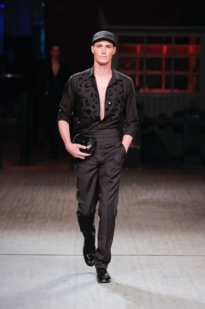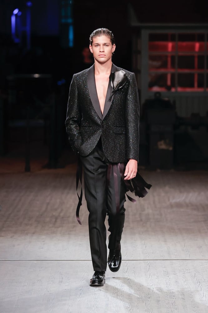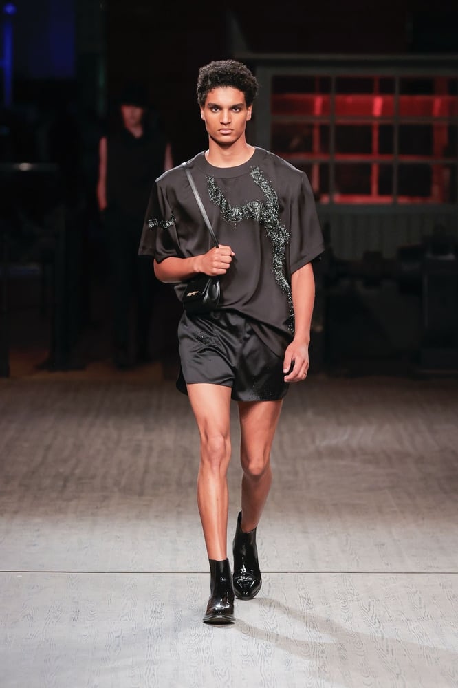 黒とリッチなファブリックがポルトガルのブランドの卓越性を示し続け、男女ともにストーン、スパンコール、パールをちりばめた手刺繍のディテールが際立ちます。プレミアムなルックは、ミゲル・ヴィエイラが世界各地で際立つ理由の一つであり、常に考え抜かれ、「邪悪な洗練」によって昇華されたシックさを誇ります。