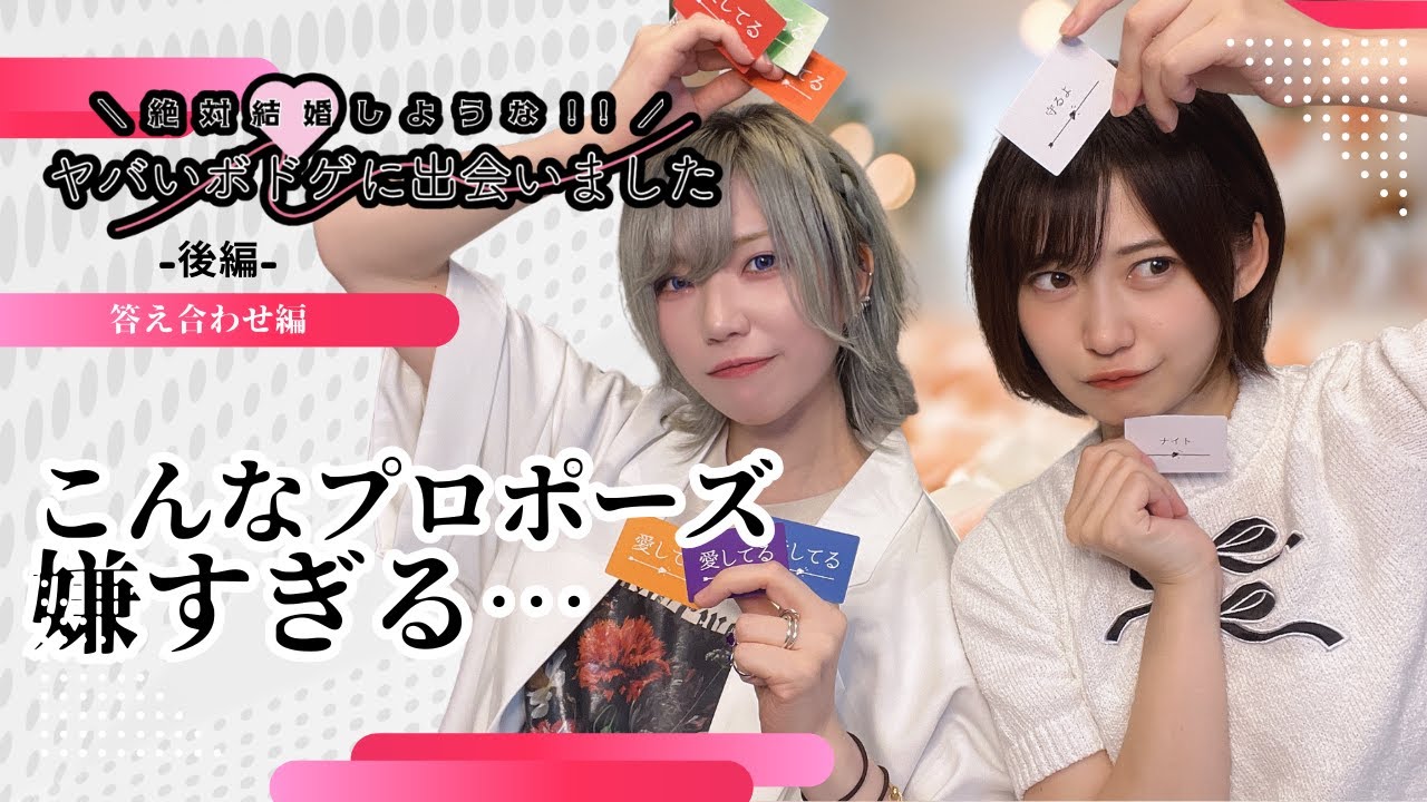 僕はボーリングラブ伝線病愛してる。 僕の消すことのできない悲しみを埋めてくれるかい?君だけの運命になってあげるよ。愛してるですね。 [音楽] 幸せってきっと君。僕は幸せな君を守りを愛してる。 誰よりも大切にするよ。きっと大丈夫。君はハッピー。 僕に手料理を作ってくれないか?幸せに なってくれないか?一緒一緒だよ。 愛してる愛 にとって永久に地獄みたいだね。 [音楽] というわけで、 はい、 結果発表。 結果発表だ。 やっと結果発表。 急にね。え、 いや、どれだろうね。 先週か。あ、そうですね。 はい。あの、 いろんなプロポーズを見ていただいたんですけど、 はい。大告白大会っていう はい。 動画をアップしましたが 皆さんも見てくれました。ね。 じゃないとこ何やっているかわかんない ですよね。 はい。これどれが誰がどれを作ったのか はい。 パとせのに見せつけますか ね。せよ。 よし。え、せーのドん。 はい。顔色さんチームと ああ。え、これ全部使うってことな んだっけな。全部使ってもいいし使わなくてもいい。 え、やばいんだけどどうしよう。 あ、全部使ってもいいみたい。 あ、使わなくてもいいの? そう。 オッケー。オッケー。オ だ。グっとくるプロポーズを作らなきゃいけないから。 分かりました。え、結構むずいかも。え え、どうですか?マシさん、どうですか?どういう販売ですか? めっちゃおもろい。 やばい。 いや、やばめ。 結構甘いな。かな? え、ちょ、待って。あ、え、めっちゃいいじゃん。 え、私はこれかな? 全部使えるぞ。 え、全部使った?いけるかも。嘘。 え、私2つしか使わん。え、 カットして え、 じゃ、1個やめようか。 うーん。私はこれにしよっかなっていうの 1つできました。 嘘だ。 これです。 語彙力どうなってんの? 結構自信になる。 本当?これで うん。 すごい愛を感じる。 愛感じてる。 うん。 え、むずいんだって。 むずくない。え、むずい。むずいよね。 むずくない。 うまいこと。これらをこれらを組み合わせるんだ。 ええ、やっぱさ、あの作し作曲されてる方は上手なのかもしんない。これは本当。 うん。あ、いいじゃない?見て。良くない?こ、こう、 [音楽] どっちがどっちなんよ 確かに。あ、でもこれだな。やっぱ最初に降りてきたのが 1番強い。 第1言語はできました。第1言語。 はい。 発表していただけますか?行くよ。 はい。僕はフーリンラブ伝を愛してる。 [音楽] どうですか? 僕はウォーリンラブ伝してる。 うん。 僕はウォーリンラブ伝線で人いり丸 [拍手] って感じで最後に畳みかけアイス。うん。なるほどね。 青色さんの はい。 発表でした。 はい。 素晴らしい。 めっちゃ良くない? マジか。 もうちょっとなんかないの? え、 なかった?そんなに ないの?カードが全然ない。 そうし、もうあ、は、配置されたカードがちょっと難しかったね。 [音楽] うん。え、ましろさんどう? じゃあ行きますよ。 え、結構使う? めっちゃ使う。ちょっとゆっくり取って。 マジ?オッケー。 行くよ。 はい。 僕に。 ここね。僕に。 はい。僕に。 う、テルオリー。 おお、上手。 作ってくれないか? え、ねえ、いいカードもすぎだろう。幸せ、 幸せになってくれないか。なんかあれだね。一緒、一緒だよ。 [音楽] ええ、可愛い可愛い。 [音楽] かいい。 出た。愛してる。え、なんかこのさ、質問ゼべ感いいね。僕に手料理作ってくれないか? [音楽] はい。 幸せになってくれないか? はい。 一生一緒だよ。愛してる。 可愛いにん。なんだこいつ。 緑の。 はい。 え、白です。 なんでこんないいカード持ってんの? え、で、この なってくれない、 なってくれないがずるい。ずるい。 イエー。そ、 緑の緑の分はこんな感じですね。 いや、でもいいな。なんか手札はすごいあの持ってますね、やっぱ。 [音楽] いやあ、なんか うん。 運を運がね、 味方につけてる感じのそうですね。 手札羨ましい。超猫。 超猫君は超猫。 何これみんな分かるかな?きっとみんな村の城が作ったって思うよ。これ [音楽] 僕はホリンラブ伝ゼを愛している。はい。 お力どうなってんねん。ちなみに緑もう 1 つ激しくとかあった。激しくフォービーな。 [音楽] 激しく低料理作ってちょっと違うかなと思って。 [音楽] いや、めっちゃいい。激しくて料理を作れって。なんか新しいね。チャーハンとかで。 そうそうそうそう。はい。次行こう。次、 次行こう。次行こう。 ちょっとなんか負けたみたいな気持ちになったからさ。で、 くそ。あ あ、これいけるかも。おら。 はいはいはい。 え、 いい、いい、いい。 あ、めっちゃいいかも。 あ、 やばいよ。今ね、来てる、来てる、来てる。 夢女子がすごい好き。あ、あー、やば。え、私もこういう人大好き。本当にさ、うん。 [音楽] 本当にこういう人好き。 自分が好きな。こ、あ あ、もう、もう、もう、もう。これでもこれはめちゃくちゃ決まっててどうしようかな。え、これあのさ、ムザン様がね、私に言ってくることに告似し