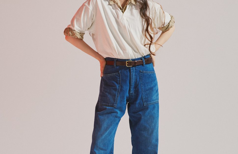 夏のデニムパンツはオンス(=重さ)のライトなものがおすすめ。例えばこの《ブルーブルー》のデニムパンツは9オンス。ベーシックな12オンスと比べてとっても軽やかな履き心地です。ヴィンテージ調のシワやあたり、風合いも良い感じ!スキッパーネックのポロシャツからちらっとチェック柄を覗かせて、洒落感たっぷりな着こなしに。