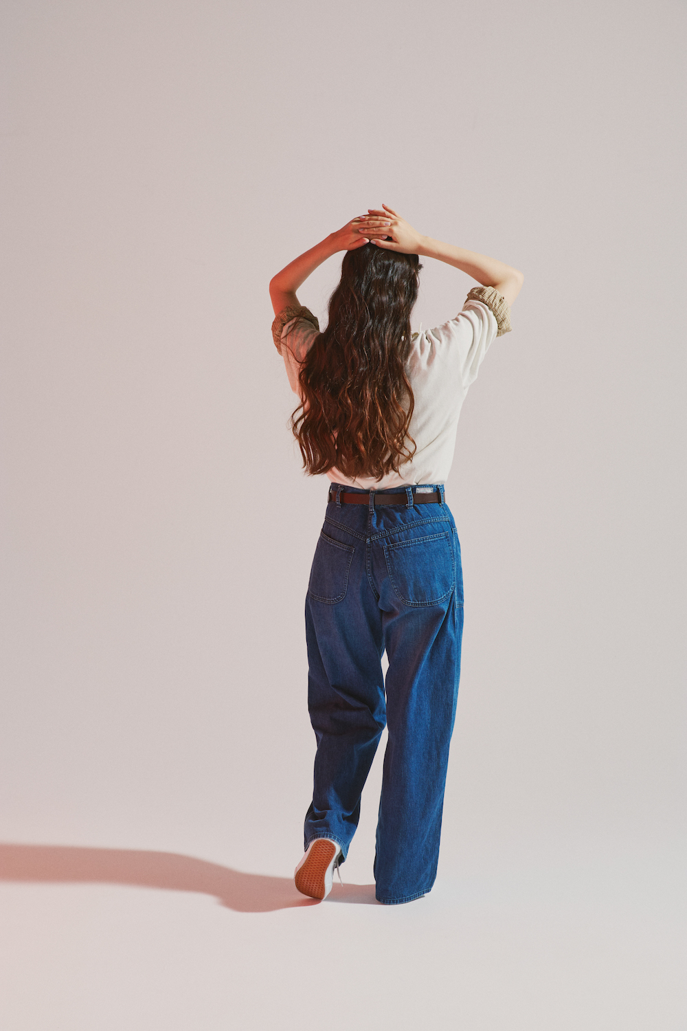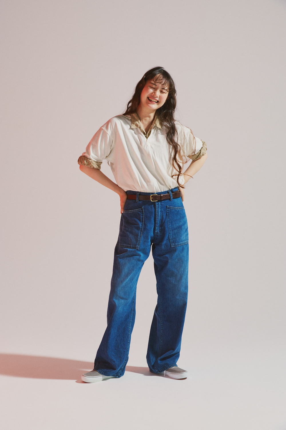 ポロシャツ¥14300/ANATOMICA(アナトミカ 東京)、中に着たシャツ¥23980/MASTER&Co.(マッハ55リミテッド)、デニムパンツ¥35200/BLUE BLUE(ハリウッド ランチ マーケット)、ベルト¥13200/BLUE BLUE(ハリウッド ランチ マーケット)、スニーカー¥5390/VANS(エービーシー・マート)