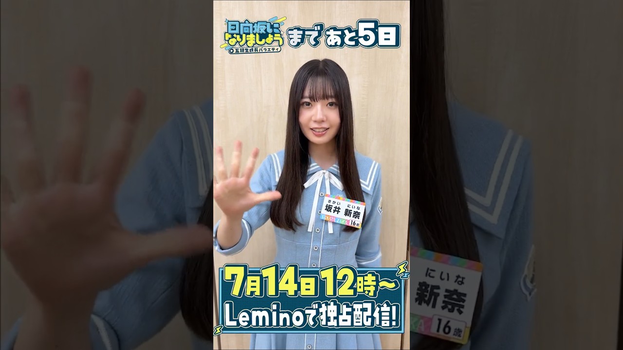 皆さんどうも日向坂46ご規制の酒井です 。ご規制日向坂になりましょうまであと5 日私はすごい寸撃とかもやっちゃったりし ているのですごくごみんなの魅力たくさん あると思うので是非ご覧ください。 YouTubeのレミノチャンネルでの 初回の強盗先行を配信中です。レミノでの 本編配信は7月14日月曜日に是非見て ください。 日坂になりましょう。