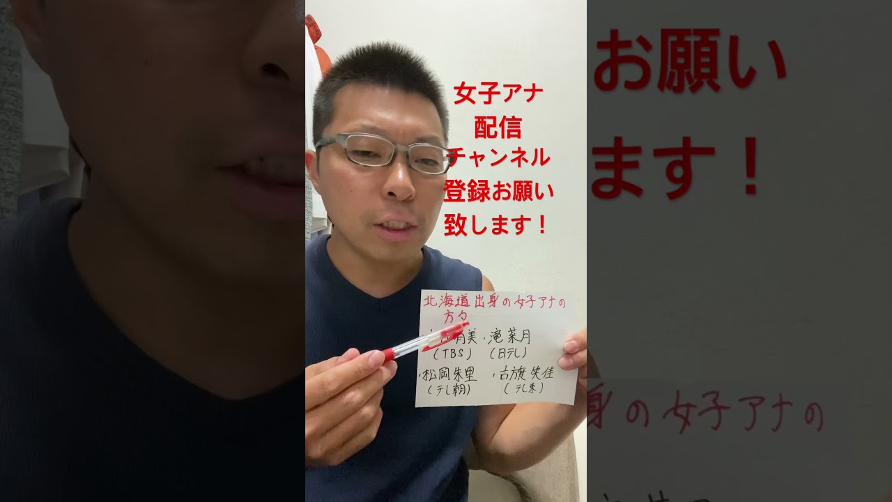 はい、皆さん、女子穴大好きバイ プレイヤータレントの瀬戸口吉義吉之です 。今回は北海道出身の全国局女子穴の方々 を皆さんに紹介していきたいと思います。 まずはTBSからNスタンダードに出演さ れていた古やゆみさん。次に日本テレビ から昼ナンデスに出演されていましたナ さん。次に2024年入社のテレビ朝日 からは松岡女司さん、テレビ東京からは 古え香さん。この4名が実は北海道出身の 全国局女子の方々であります。今回も女子 穴の紹介をさせていただきましたが北海道 は意外と全国女子の方々の配をしており ます。今後も活躍が非常に楽しみですね。 それでは皆さんまた次回そしてこの YouTubeのチャンネル登録も是非お 願いします。それでは皆さんまた次回。