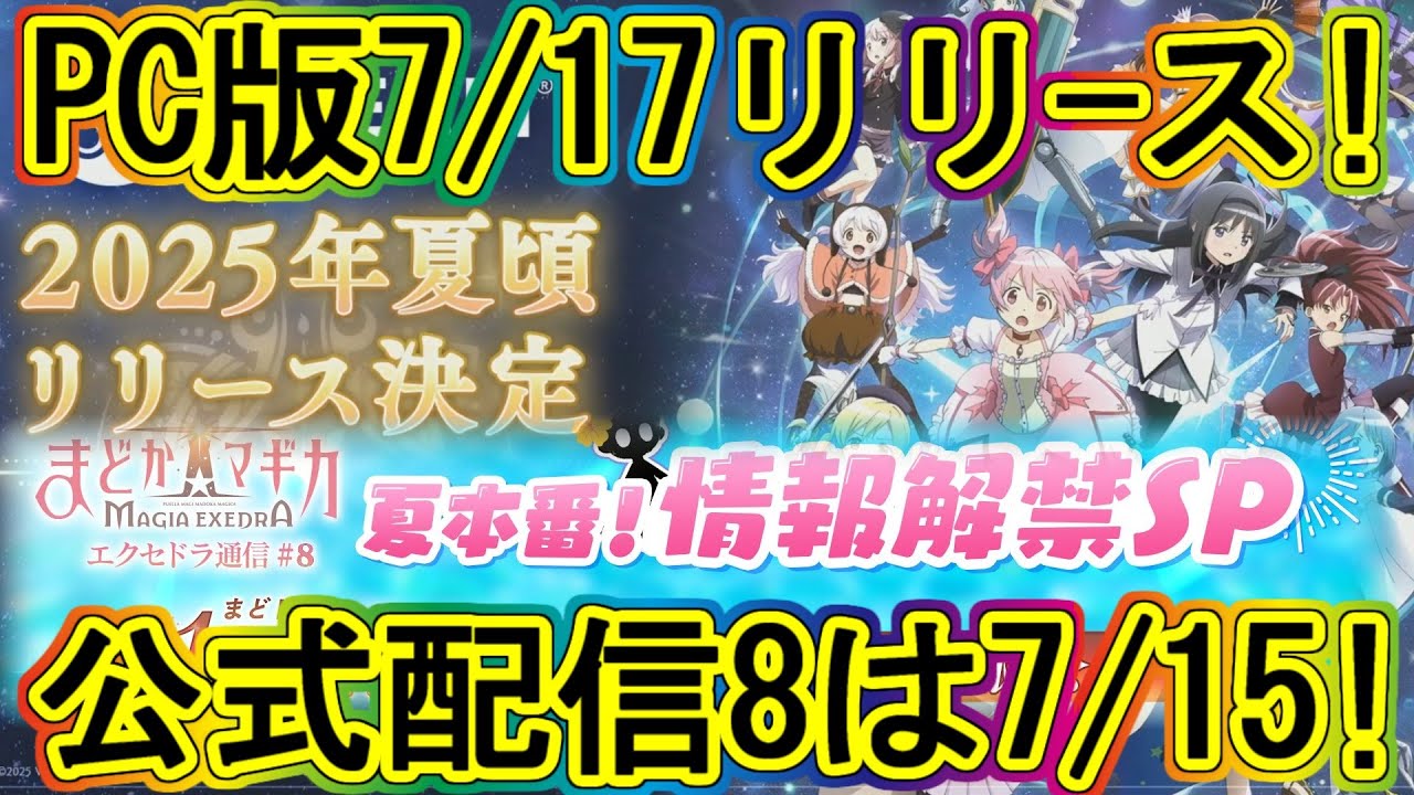 [音楽] 再生ありがとうございます。本日は大きい お知らせが2つ来ていましたので紹介し ます。まず1つ目はエクセドラ通信。 こちらがもうあと数日後ですね。7月15 日火曜日の20時から第8回目の エクセドラ通信100日祭第2弾とそれ から マルプルギスの回転ですね。夏本番情報 会禁スペシャルということで放送が決定し ていました。それからもう1つが Steam版の配信が7月の17日ですね 。エクセドラ通信の2日後に決まりました というお知らせ。こちらの情報を触れて いきます。と言っても細かいところは出て いないので、ま、相当 妄想ありきの話になってしまいますが、 まずはエクセドラ通信から行きましょう。 今回第8回目となるエクセドラ通信ですが 、また火曜日ですね。確か前回も平日 火曜日だったような気がしますが、7月 15日火曜日の20時から放送開始となり ます。引き続き 名前ちゃん役の小山さんとあとは今回 VTR映像出演でまどか役の勇井さんです ね、出演が決まっているようです。それ からあとはワルプルギスの回転に関する ことも含めた情報ですね。ゲーム内も もちろん100日感謝祭の第2弾という こともありますので、果たしてどんな情報 が来るでしょうかというところ期待したい ところです。ちなみに前回第7回目の エクセドラ通信では100日監査祭第1弾 の情報だったりとかあとはロードマップ ですね、一部紹介があっておりました。 ロードマップとしてはまだ7月中旬までの 情報しか出ていませんでしたが、 とりあえず この エクセドラ通信第8回目の前後で プレイヤーレベル魔力解放の上限解放が 来るのかな。そんなところになります。 そのため今もうあのクエスト詰まった時 ガチャ引くしか強化手段ないけどなみたい な困っていた方は純粋に編成の底力を 上げることができますので今詰まっていた クエストだったりとか突破するチャンス あるかもしれません。中旬というところは まだ具体的に日程が分かりませんが、もし かすると日程次第ではタワーの攻略ここが 少しでも進められるかもしれませんので、 もしタワーの開催期間中の上限解放であれ ば是非詰まっているタワーももう1度は 挑戦していただければなというところです 。 はい。え、それから第1弾の情報を改めて 振り返ってみましょうか。そこから、ま、 勝手な妄想も含めてではありますが、 果たして第2弾100日監査祭でどんな ところが来るのかですね。100日祭で どんなところが来るのかですね。 うん。正直第1弾もなかなか 大きいものは多かったですね。マギカ ストーンのログインボーナス2000個で あったり、あの無料ガチャが結構累計30 連ぐらいですかね、来ていたり、それから 三日月想の星5キャラクター1人選んで 交換できる、ま、特別クエストが開催され ていたりというところが特に大きかったの かな、個人的には。いや、是非第2弾、 ここに引けを取らないくらいの キャンペーンが来てくれると嬉しいかなと 思っております。 ログインボーナスであったり、ま、無料 ガチャもじゃ、さすがに30連はオーバ ブル舞いすぎるかもしれないので、少し 落ち着くかもしれませんが、何かしらまた 無料ガチャ少しでも開催してくれると 嬉しいですし、あとそれからこれは無理か な。星5の三日月の交換がありましたが、 安ゆく場 残り5人の初期実装組の誰かから選んで もらえる第2弾であったり、ま、もしくは 初期実装組ではなく、ま、三日月総組だっ たので、そこは、ま、追なすというわけで はないですけど、三岳原組ですかね。は、 ちょっと高発組の実装キャラもいるので 難しいかもしれませんが、何かしらまた星 4記憶選んでもらえますよみたいな キャンペーンクエストやってくれると、ま 、めちゃくちゃありがたいかなという ところになります。はい。こればっかりは 蓋を開けてみないと第2弾どんな情報が 来るか分かりません。個人的には第2弾の 方が第1弾よりもグレードアップして 欲しいという思いはありつつ、ただ、ま、 実際に100日はもうすでに過ぎてしまっ ていることなので果たして、ま、過ぎた後 の第2弾でどこまでちょっとオーバブル舞 してくださるのか、その後には難しい ところもあるかもしれませんが、ま、角度 な期待はしないようにしつつもちょっと ワクワクは持っておきたいので、非非常に 悩ましいところになっております。 とりあえずは現状100日剤第1弾はこれ くらいのキャンペーンがあっていましたの で同等もしくは超える第2弾の キャンペーンやってくださると嬉しいかな という感じです。はい、とりあえずこちら がまずはエクセドラ通信第8回目。こちら に関する、ま、情報というか、ま、ほぼ ほぼよくですね、自分の個人的な希望、 欲望、妄想をお伝えさせていただきました 。それから続きましては一部の方に、ま、 非常に影響のあるSteam版、PC版の 窓ドラの配信決定ですね。元も決定はして いましたが、正式に日付が7月17日 エクセドラ通信から2日後、木曜日の スタートという