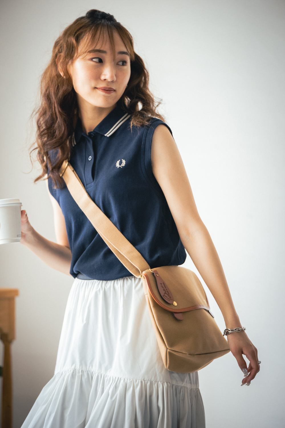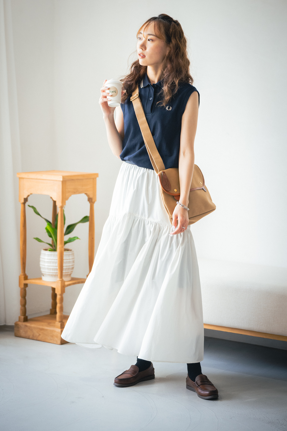 「ノースリーのポロが去年から気分で、夏によく着ています。ネイビーはどんなボトムスにも合わせやすいので重宝するんですよね。トップスがすっきりとしているので、ボトムスはちょっぴりボリューム感のあるものを選ぶことが多め。たとえばティアードスカートと組み合わせるとこんな。足元はローファーできりっと引き締めます」