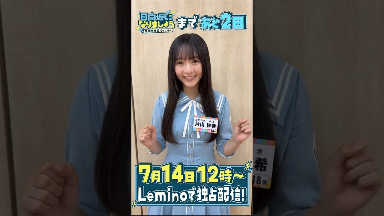 皆さんどうも日向坂 46 ご期生の片山崎です。ご期生の日向坂になりましょうまであと 2 日。私は初回の自己紹介で初年出しの特技をやらせていただきました。どんな特技か気になりますよね。 4 期生さんから受け継いだこの番組を盛り上げられるよう一生懸命頑張ります。 YouTube レミノチャンネルで初回冒頭先行配信中です。 レミのでの本編は 7月14 日月曜日。見てね。日向坂になりましょう。 [音楽] プ