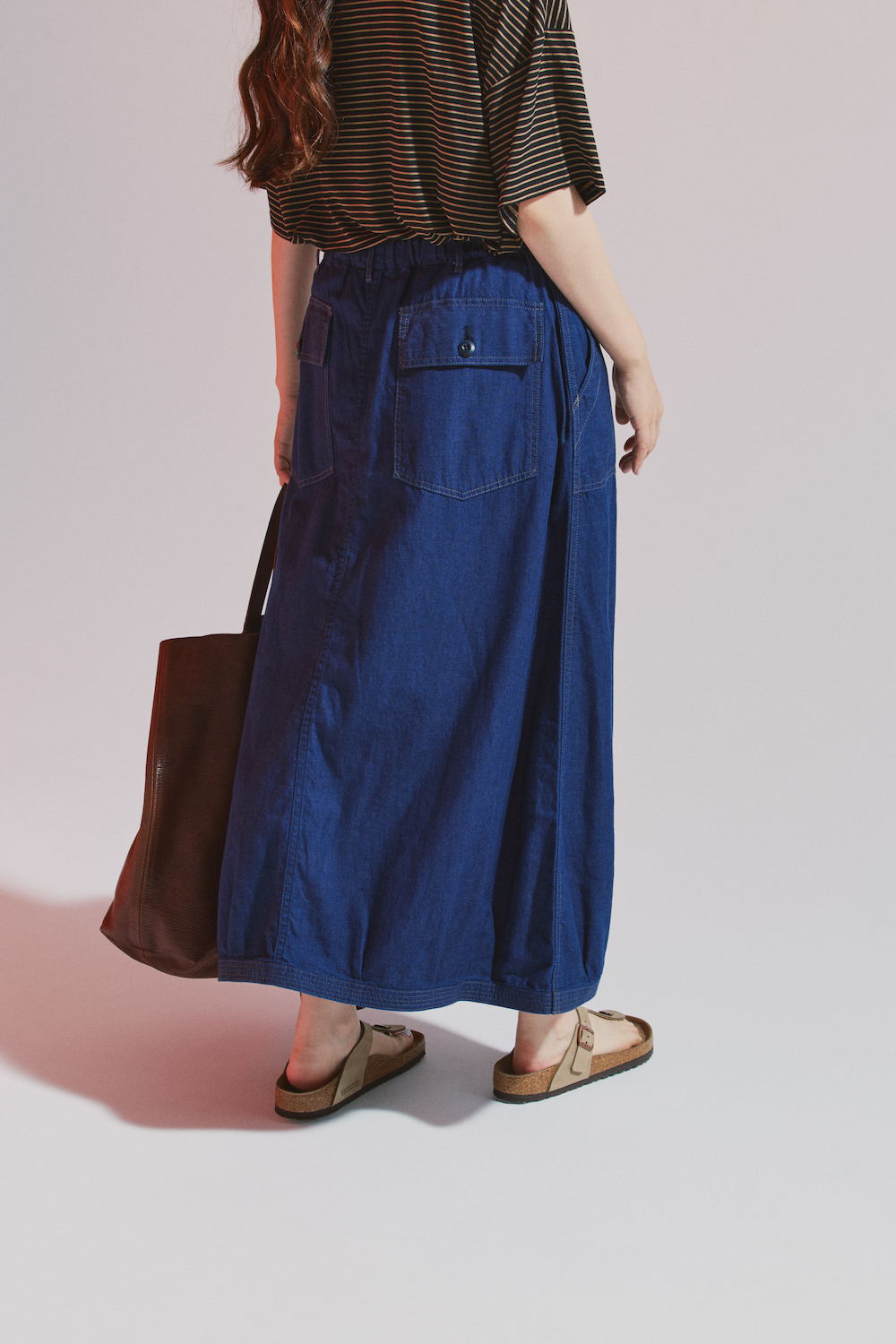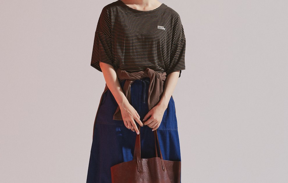 真夏もデニムスカートが履きたい!そんな時は軽量で柔らかく、風をはらんでふわっと揺れるライトオンスを選びましょう。例えばこの《オムニゴッド》の7.5オンスのデニムスカート。前後についた大きめのベイカーポケットが良いアクセントに。ブラウン×ブラックのシックなボーダーで洒落感を加えて。腰に巻いたシャツでシルエットに緩急を。