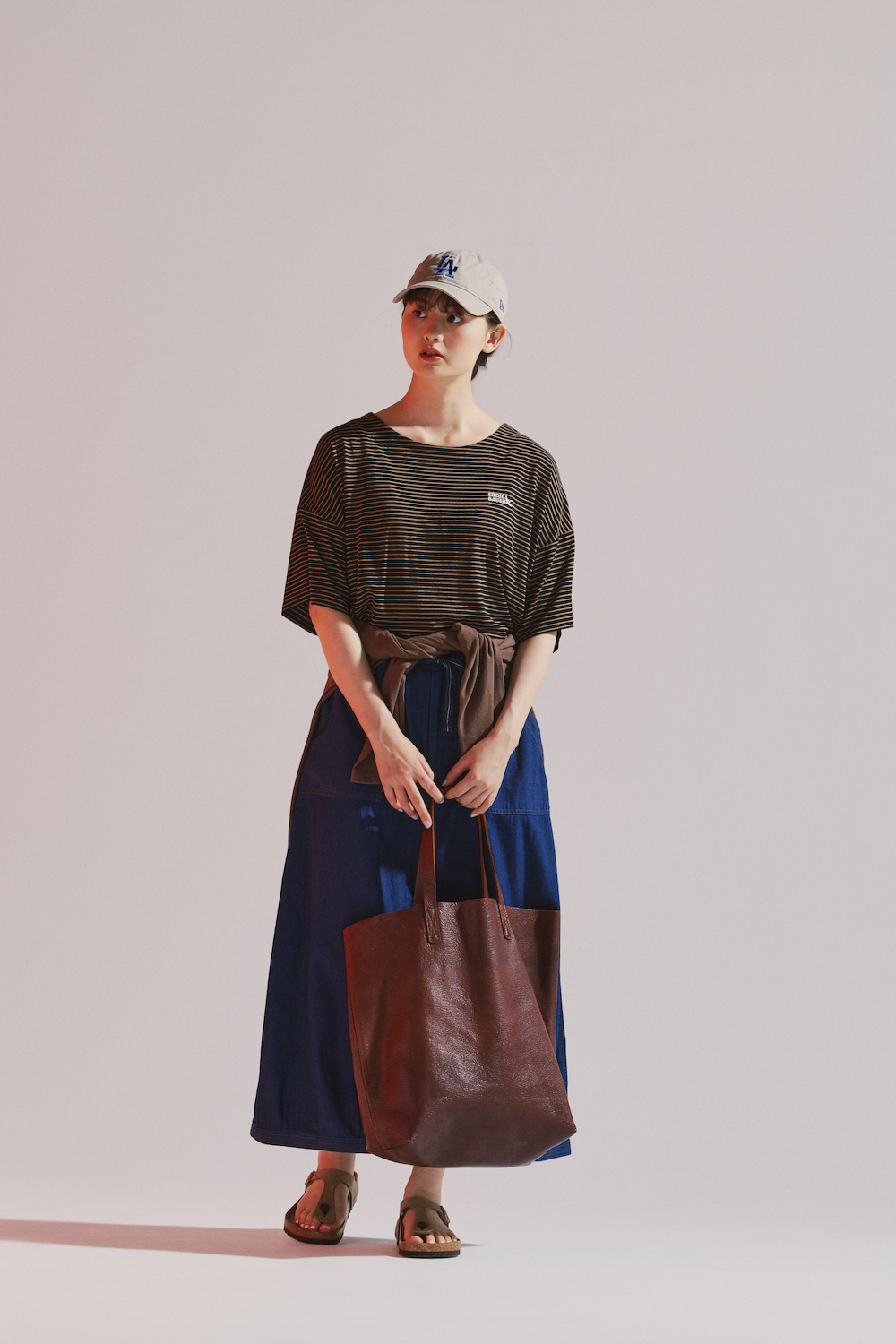 Tシャツ¥4950/EDDIE BAUER(エディ・バウアー 吉祥寺店)、腰に巻いたシャツ¥16280/Americana×JEANS FACTORY(ジーンズ ファクトリー 卸団地本店)、スカート¥20900/OMNIGOD(ドミンゴ)、キャップ¥4620/New Era®(ニューエラ)、バッグ¥42900/MASTER&Co.(マッハ55リミテッド)、サンダル¥17600/BIRKENSTOCK(ビルケンシュトック・ジャパン カスタマーサービス)