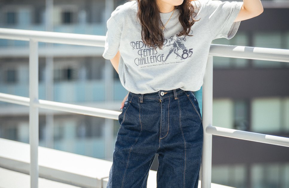 「Tシャツとデニムの定番コーディネートは、赤キャップで差し色を加えるのがお気に入り!低彩度の色と合わせることで赤が引き立ちます。《スティーブン アラン》のデニムは縦にステッチが入っていて、脚がすらっとして見えるので愛用しています」