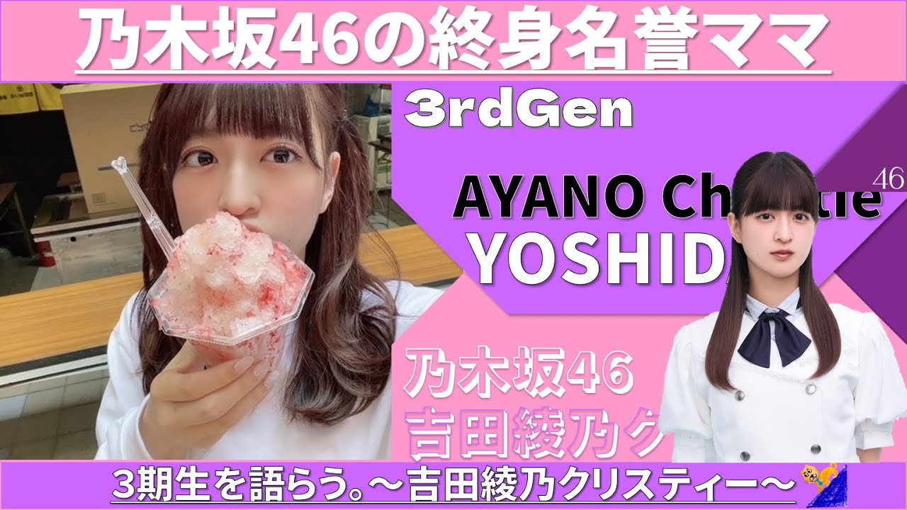 さあ、本日は3期生を語らう吉田、綾 クリスティ編ということでございまして、 ま、もうね、加入から9年以上経ちまして 、ま、最年長期となった乃木座金瀬をね、 思う存分語り尽くしていこうではないかと いう時間でございまして、え、ここまで ですね、えっと、リリア、レンタん、梅沢 さん、久保ちゃんとね、もう4本動画 上がってますので、ま、まだ見てないよと いう方は是非ともチャンネル登録しながら 見ていただければ嬉がいです。よろしくお 願いいたします。はい、ということでです ね、本日は吉田アイムのクリスティ編と いうことでございまして、ラインナップ こんな感じですね。はい。え、皆さんから 募集したアヤティの魅力、そして見たい曲 &藤名、そして吉田のクリスティを語らう 乃木坂46の就身名誉ママといったところ でございまして参りましょう。はい。と いうことでですね、まずは皆さんから募集 したコメントということでまずはこちら。 はい。え、3期生活乃木塚46の最年長 メンバーまだ20代前半かと思いきや 気づいたらもう30代気づいたらもうま、 もうすぐ30代ね。ごめん。もうすぐ30 代。え、イコマリナや、え、伊藤マリカと 同い年度したのがびっくりの46で1番 ゲームに詳しいとされているメンバーと いうことでありがとうございます。そうね 、もう最連長メンバーですね。うん。いや 、確かにね、まだ20代前半かと思いきや 気づいたらもうすぐ30代。うん。確かに 。やっぱこのイコ、ま、その同世代ね、 イコマリナや伊藤マリカ、あとロッティと かもな同い年って言われると、ま、確かに ビビるよな。いこまちゃんが今も乃木坂に いてもおかしくないってことでしょ。 やばいよな。いこまちゃんが13年の木坂 に在籍してますみたいなね。ま、それは それでダメなグループだろうと思っちゃう けど。いこまちゃんがね、13年いた場合 ね。あやティはまだまだ行ってほしいです けどね。うん。そうね。ま、やっぱりこの アイドルと年齢の壁っていうところは、ま 、去年のこの3期生通信もした エキリスティ編ってところで、ま、結構 しっかりと深くね、お話しした部分では ありますけれども、ま、今年で30歳かな 、やも今突入してくるということで、その ね、9月でね、うん。ま、ここの節目を 超えていくのかどうかというところは、ま 、注目ポイントという表現が正しいか 分からないけれども、まあ、1つの タイミングではありますよね。ま、ただ やっぱり前のタイミングで、ま、卒業する のであれば、ま、もう卒業が発表されて いるはずですし、ま、アンダーライブって いうところも確か10月だったかな、2年 横浜であるということだったので、ま、 そうすると9月6日っていうところは、ま 、神宮球場、ま、必然的に超えてくるか なっていうところではありますので、ま、 あ、は、ま、間違いなく30の壁を超えて くるだろうなっていうところですよね。9 月6日って先週だっけ?2025年9月6 日は土曜日かね。土曜日3日目かなという ことでね、ま、あやティ押推の人からね、 こう全国つ裏からね、この3日目の神宮 目指してね、集まってくるのではないかと いうところではありますけど、ま、でも3 日目が多分1番行きやすいすよね、神宮ね 。うん。土曜日なんでね、ま、土日休みの 人は基本的にあの地方とかから遠方から来 られる方は、ま、土曜日の公演を目指して くると思いますので、ま、意外と日曜日 よりも、ま、土曜日の方がこう激戦区 みたいチケットの相談率高めみたいなこと もありそうですね。はい。そしてもう1つ こちらですね。はい。え、多くのメンバー が精神的に助けられている存在なのは 間違いないでしょう。え、想像でしかない ですが、1番助けられたのはもしかしたら 梅かもしれないですね。え、もはやアティ がいるだけであの空気も良くなるから超高 性能な空気正浄機かもしれない。 ちょ、終盤のコメントの急回すごかった けれどもね。空気正浄機に例えてくると 思わなかったですね。ありがとうござい ます。そうね。ま、やっぱりこの梅沢さん が、ま、いろんなメンバーの支えになって きた。梅沢さんじゃないアヤティがね、 なってきたっていうのは、ま、もちろん 紛れもない事実だと思いますし、やっぱり その中であやティじゃなくて、えっと、 梅沢さんね、逆になってた。はい。 やっぱり、ま、すごく色々と助けられた 部分は、ま、少なからずあったんじゃない かなっていう。でもね、こう我々としては やっぱりこの梅沢さんとアヤティのミン ティっていうところに関しては色々とま、 こう思いがあったりはするんですけど、ま 、なかなかそれが発信されることがねな いっていうのは、ま、リアルなところでも あるというかね、やっぱりこうお互いの口 からなかなか語られることのない2人ペア ではあるから、ま、その分ね、こうたまに 2ショットとかがアえティのインスタとか に乗るとうお、ミンティがみたいなね、 気持ちになって