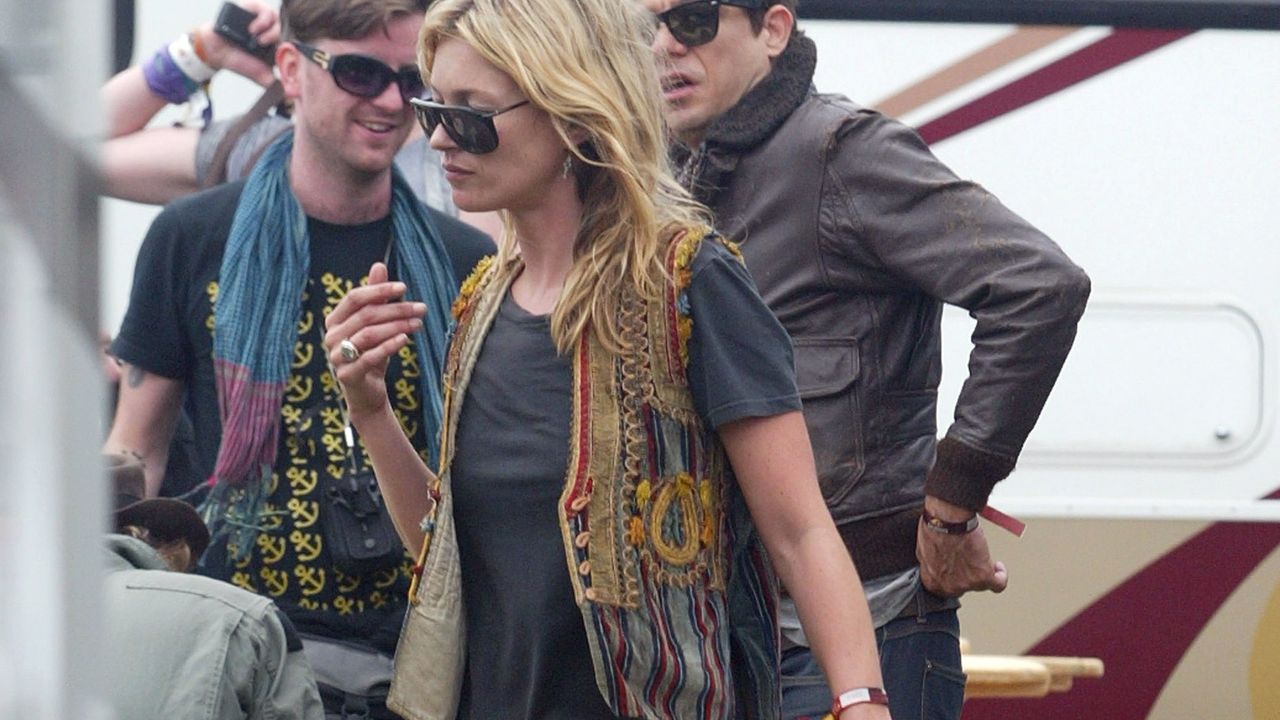 ケイト・モスは、2000年代以降のフェスファッションを象徴する存在として語られてきた。イングランド南西部サマセット州で開催される世界最大級の音楽フェス「グラストンベリー・フェスティバル」でのケイトの姿は、ヴィンテージ風のベストとショーツにハンター(HUNTER)のラバーブーツ、ロックテイストのブラックのタイトなジレとハート柄スタッズバッグに同じくラバーブーツを合わせるなど、足場の悪いアウトドアでも輝くミックススタイルを体現していた。