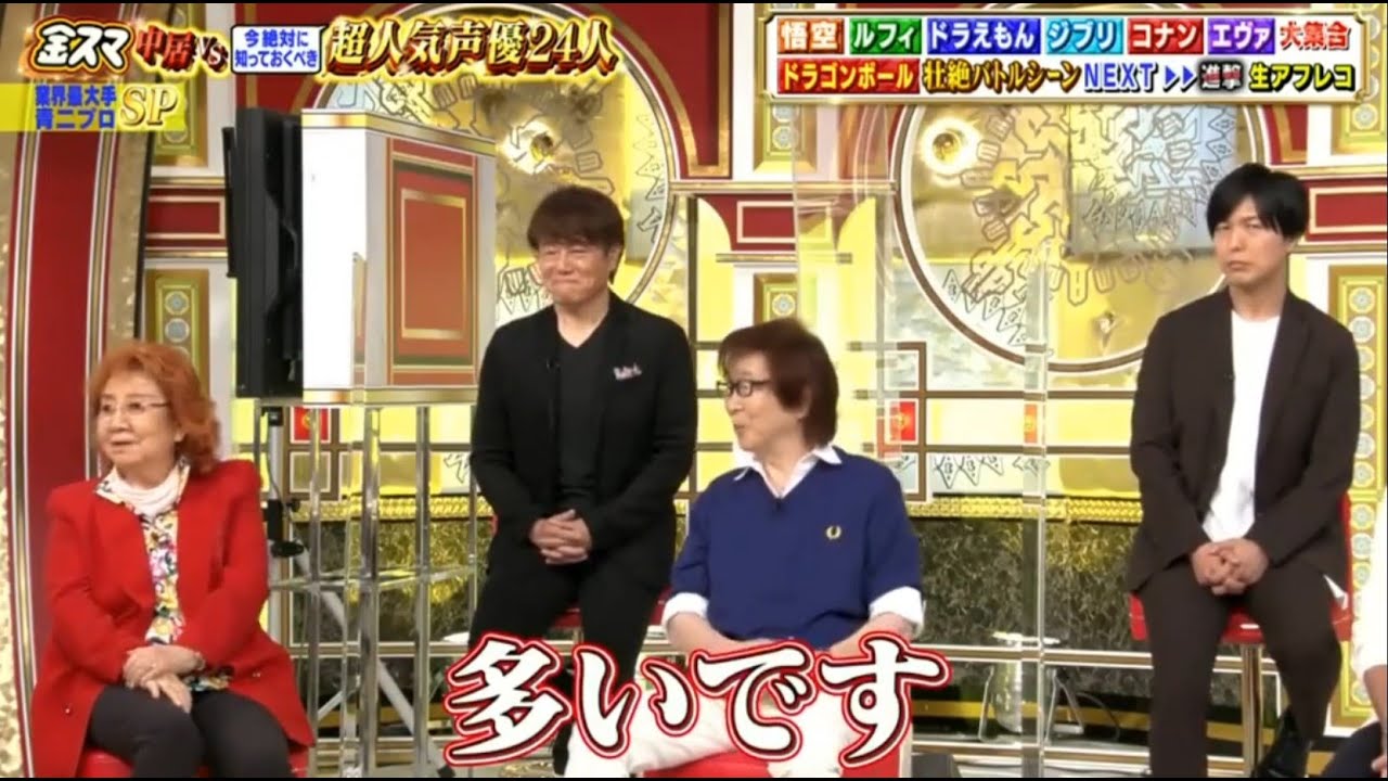 さあ、今夜の新スマですが、過去には人力者渡辺エンターテイメントと、え、芸能事務所のメンバー大集合をやらさせていただきましたが、今回は第 3 弾ということで、事務所青鬼プロダクションから 24 名の声優さんが第集合。よろしくお願いいたします。 これはすごい。どうした? 大。 さて、宮田さん。 はい。 ま、宮田さんはアニメ好きだってのは伺ってますけど。 いや、僕ほ、もうアニメ好きになってからもう 20 年ぐらいずっとアニメ大好きなんですけど、 生まれる前から、 え、僕32 なので、あの、僕いくつだと思ってました。 18 かと思っ いやいや、18 なわけないじゃないですか。 いや、でもこの会社は本当にすごくて、 もう声優会のジャニーズ務賞 おお と言っても過言ではない。 声優会のレアルマドリードと言っても過言ではないぐらいですよ。 [音楽] 一川さん、どうでしょう? いや、もう本当に脳がバグりそうです。私ここ いや、なんかいろんなもをもう子供の頃から大好きな声とかもうあちこちに聞こえて あの声だ。この声だって。 はい。もうね、最興奮ですね。 さて、野沢さん はい。 こうやって以上にこうやって集まるってことって番組によってあったりするんでしょうか? ありますよ。24人。 あ、あるんですね。24 にあります。 あるんだ。 じゃあ皆も顔見知りでよろしいですか? あ、全員知っております。 あ、全員知ってる。 すごいファミリー感がすごい知ってる。 フレさん全員知ってるよろしいですか? 嘘ばっかついて [拍手] おかしいと思った。フレさんなかなかこうやってみんなが集まるってことは いやこのメンバー集まることまずないですね。 まず野沢さん まずない。 あれ野沢さんどっちなんですか? あ、気持ちとしては会いたい。 気持ちとしては 大事なことですよね。 1番奥のブルの子何て子ですか? 女性です。 おいおいおい。おかしいだろ。神 神が女性って言ったらもう女性ですから。 嘘は言ってないです。 るのが誰ですか?女性で正解だよ。 創業52 年日本初の声専門の芸能事務所青プロダクション 教会最大手 400 人を超える声優人の中から今夜は今絶対に知っておくべき [音楽] 24人が大集合。 俺は あの人気キャラクターたちの声を演じる声優たちを 皆さんは何人知っていますか? まずは超映像やクイズと共に送る特別紹介 VTRをご覧ください。 そしてナビゲーターを務めるのはこの人。 声優会のジャニーズ青鬼プロダクションのメンバーたちをご紹介。ナビゲーターは私田中が務めさせてもらうぞ。 [音楽] まずは青鬼が誇る声優会のビッグ 3。その1人目は 世界中にファンを持つ日本アニメ界のスーパースターといえばこのキャラクター [音楽] スーパーサイヤ人孫悟だ。 [音楽] そうラゴンボールで孫悟を演じる 野沢正子です。よろしくお願いします。 ちっちゃく声急に ちょっと気ってみました。 ちなみに海外でも大人気のドラゴンボール世界 80カ国以上でも放送されており フランスではなんと視張率 60% 以上を記録したこともあるそうだぞ。すごいね。 すごい。 こんな悟空を演じる野沢さんは他にも銀河鉄道 39怪物君などなんと 250作品以上に出演さんね。 中には人間以外のこんなキャラクターも うわ、もう すごい。 あら、 そう、この荒いグマラスカルの可愛い鳴き声も実は野沢さんの声。 さらにこの新井グラスカル、この男が声優となるきっかけなんだって。 福君。 はい。 こんにちは。 こんにちは。初めまして。 初めてだね。 初めてです。う、いいつも父がお世話になってます。本当 うちの蜜光が本当お世話になってます。 広み光じゃないの?福君も声優さんとして今 やらしてもらってます。はい。 はい。 野球じゃなかったんですね。 僕野球に興味なくて 幼稚園の時から声優になりたかったので [拍手] でその時に うちの父に僕当時荒井熊ラスアスカルが大好きだったんですけどお前の大好きな 似合わないなんか お前のお前の大好きな 新井グマラスカルものさんま子さんっていう人間が 新井グマをやってるんだよって教えてもらって うわになりたいと思ったのがきっかけで [拍手] い、 そう考え福君ちゃんとなったね。 はい。なんとかちゃんとなりました。はい。 突然ですが吉村さんに失敗。 [音楽] 声優会のレジェンド野沢さんが初めて主役を演じた作品って一体なんだ?え、 最初ちょっと待って。めっちゃフィトは主人公が吉村さんと髪型がそっくりだよ。 え? 髪型そっくり。 なんか答えない時間。 え、駅太郎ですか? ではさん解をお願いします。 ゲゲゲの北太郎です。 おです。 [拍手] モクで はい。 当てちゃだめよ。吉村 正解はゲの北。 この作品こそが声優沢のデビュー作。 それではその貴重な初リフを聞ってみよ。 [音楽] ありがとう。 お父さん。野球と言ってね。近頃じゃ妖怪仲間でもブームなんだよ。おや、あの音は [音楽] 今から13年前映像もなんと白黒でした。 それもそのはず。野沢さんがアニメの世界に足を踏み入れたのはおよそ 60年前の1963年。 さ