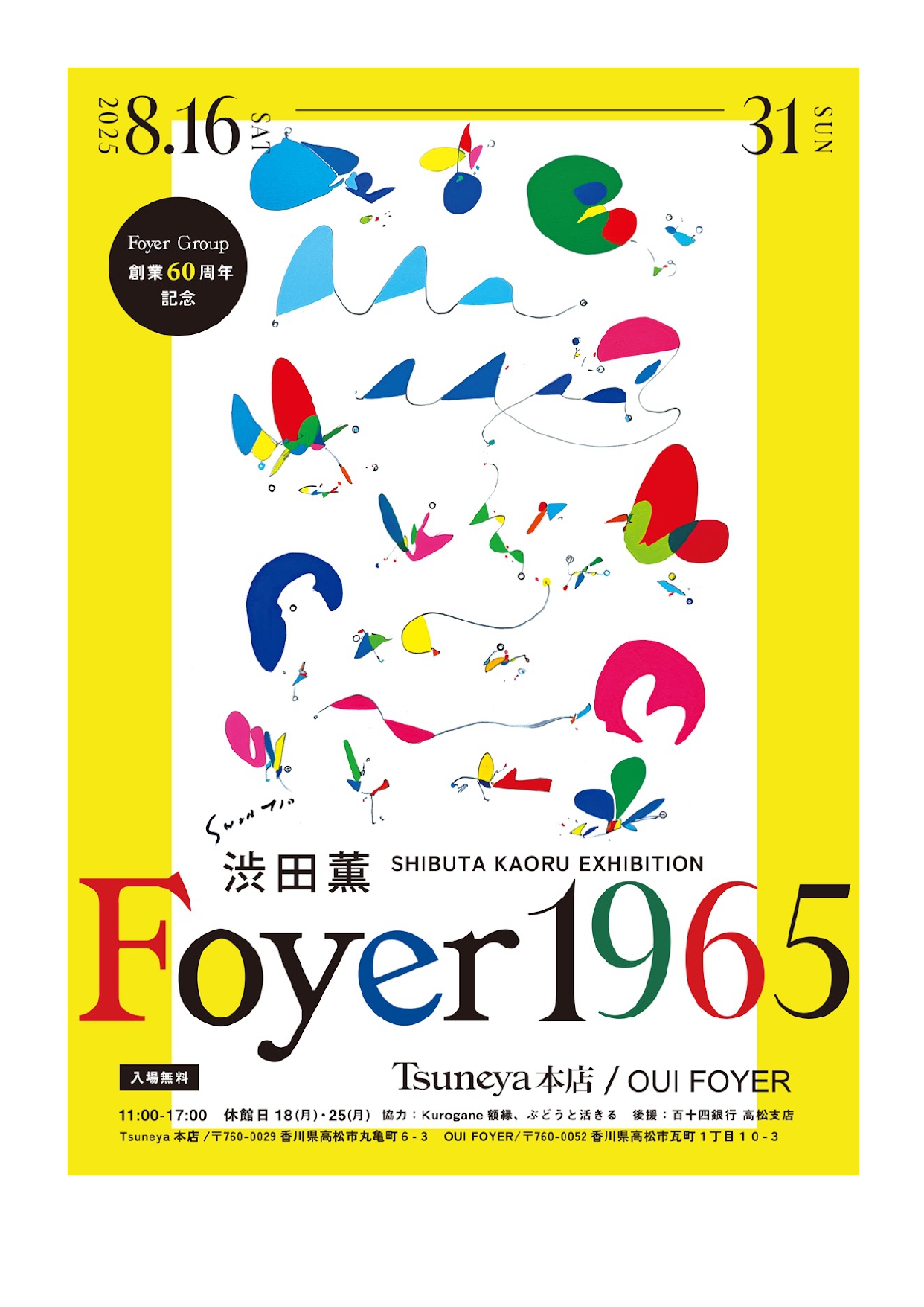 8月16日からの『Foyer1965』では、Tsuneya本店(丸亀町6—3)、OUI FOYER(瓦町1—10—3)で、浜田氏が創業の1965年にフォーカスした作品の展示をおこなう。初日の16日、14時〜は、Tsuneya本店2階で、ギャラリートークを予約制で開催する。詳細は同社ホームページまたは、Instagramで公開予定。