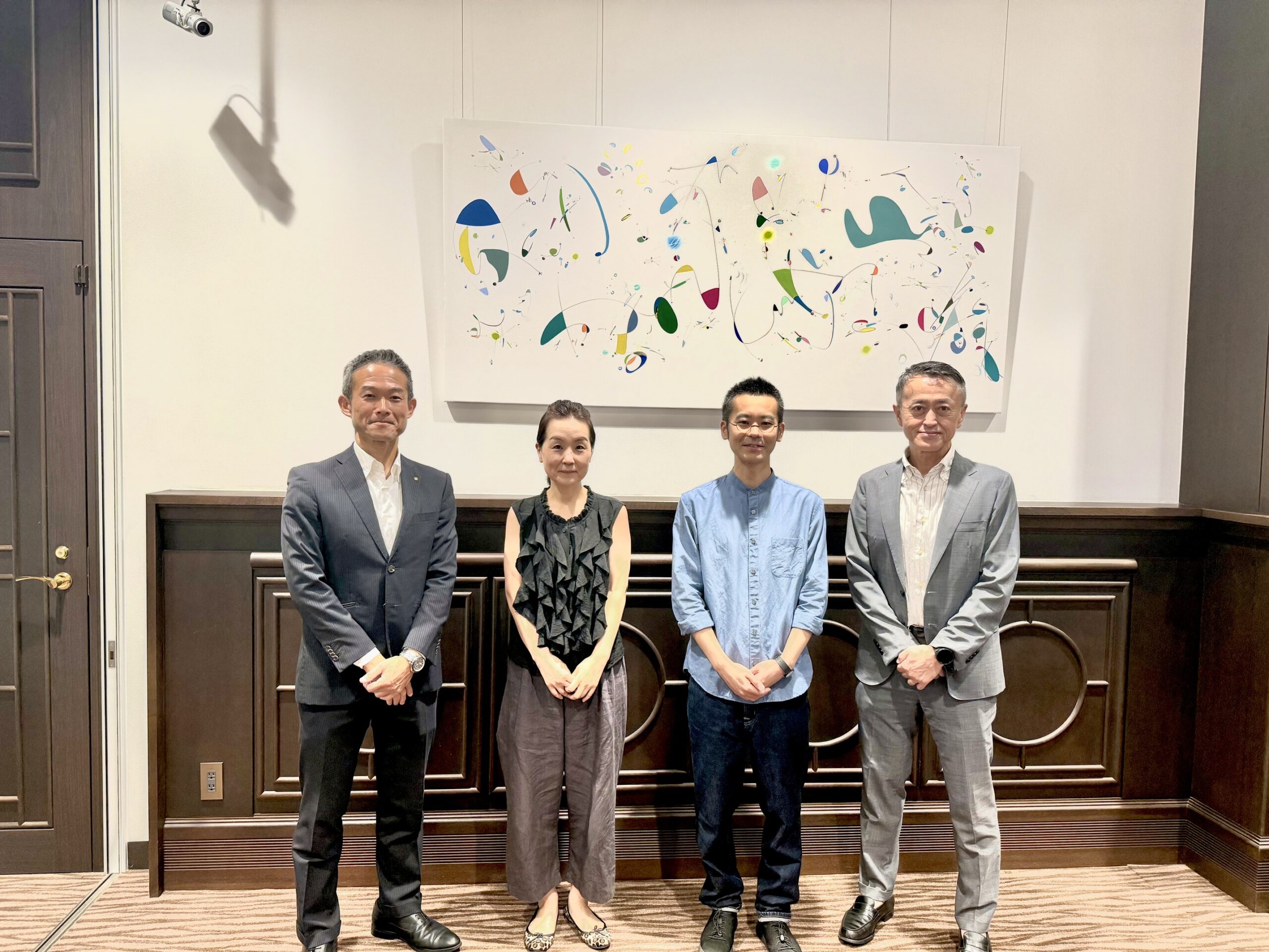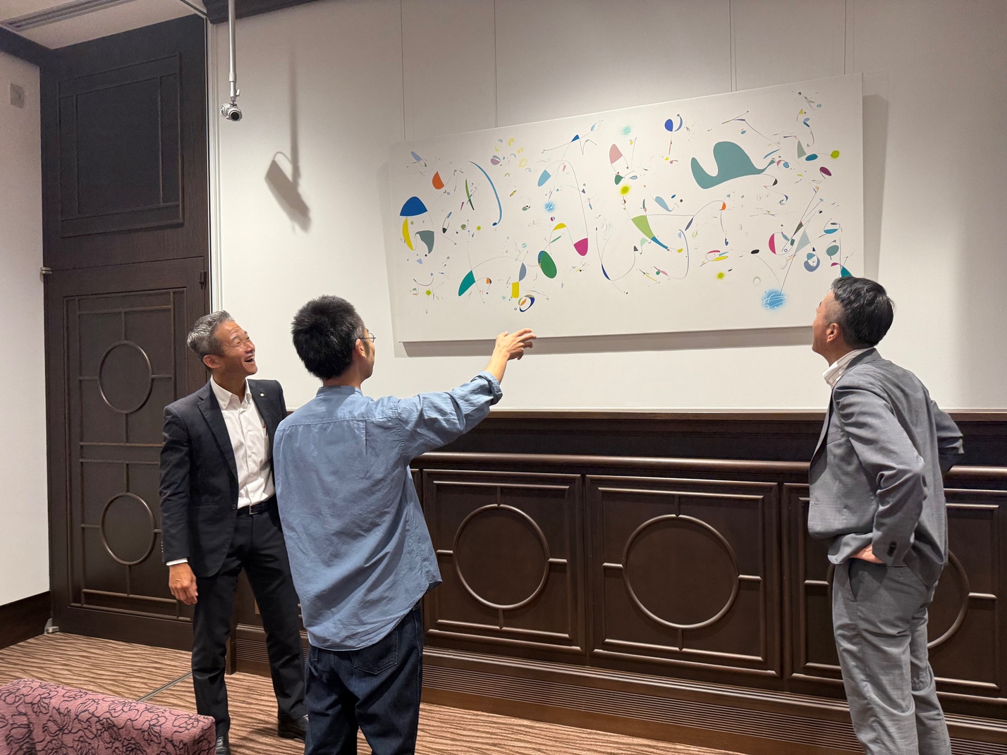 開催に先立ち、銀行の日、7月1日には百十四銀行高松支店(三木勝之支店長)の待合室壁面に、『讃岐津田』(92×197㎝)と『BACH BWV』(95×200㎝)を展示した。この2作品は、レトロな雰囲気のある高松支店の壁面に合わせ、新たに制作された。