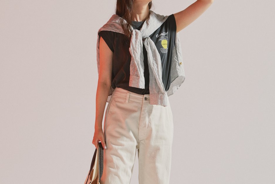 ノースリーブTシャツ¥7150/GOOD ROCK SPEED(グッドスピード)、肩にかけたシャツ¥23980/MASTER&Co.(マッハ55リミテッド)、パンツ¥30800/Véritécoeur(ヴェリテクール)、キャップ¥4620/New Era®(ニューエラ)、バッグ¥12100/L.L.Bean(エル・エル・ビーン カスタマーサービスセンター)、シューズ¥58300/QUODDY(メイデン・カンパニー)