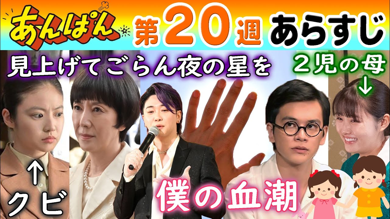 [音楽] NHK連続テレビ小説アンパン先行大まか なあすじです。ネタバレになりますのでご 了承ください。 8月11日から15日放送第20週 1953年昭和28年 柳内孝志北村匠は三星百貨点を代謝し漫画 家として独立を果たす。 今未だ美は夫た志の独立を祝いこれを気に た志さんと呼ぶようになる。 市は独漫画派というぶれない漫画家集団に 所属する。 漫画家集団に回ってきた仕事は所属する 漫画家たちで割り振ってこなすことになっ ていたが、いい仕事は孝志にはあまり回っ てこないのだった。 一方大義師マ哲子田け子の秘書として働く の部はある日哲と児童福祉施設員の面会を 独断で設定してしまう。 員が帰った後、哲に勝手に予定火炎取って 年かられたのは哲に詫びながら改めて秘書 として働き続けさせてほしいと訴える 探し門があるがです。 のぶは哲の元で働くことでそれが見つかる と信じていると話すのだった。 一方その頃、たしは逃げた大物漫画家の 連載の穴埋めで名けボという漫画を書いて いた ところが書き上がる直前になって漫画家が 見つかりお入りとなってしまうのだった。 [音楽] その世は山之助つが雇われ店長をしている 雑貨店を尋ねる。 は1人つやく。夜の底に黒い犬がいて小声 で吠える。ボンボンせしボン。寂しい人。 ボンはあなたの友人です。 ヤギは誰の死だと尋ねる。 僕の漫画に出てくる犬の死です。 どこにも掲載してもらえないと嘆くしを 大衆なんかに媚びずお前らしいものを書け ばいいんだよとヤギははげます。 するとそこに哲が姿を表す。 たしがの信の夫だと知った哲はのぶが探し ているものとは何なのかと尋ねる。 何が起きても逆転しない正義のことだと 思います。 彼女は戦争中逆転した正義に流されて子供 たちを導いてしまったことに今も追い目を 感じてるんです。 翌朝哲は出勤したのに介雇を言い渡し合い の会社の紹介を差し出す。 学然とするのぶに哲はこういうのだった。 ここにいてもあなたの探しているものは 見つからないわ。 その日帰宅したのは哲に解雇されたことを たしに言い出せずにいた。 たしの方も実は全く仕事がないのに前では 仕事がたくさんあるかのように振るまって いるのだった。 ある日の信は高の母と富子松島七子の家を 尋ねる。 ノぶは以前と富子を嫌な気持ちにさせて しまったことを謝り自分が秘書解雇された ことを打ち明ける。 そして孝志しがトみ子を気にかけていた ことを伝えるとトみ子はしは優しすぎるの よ。清さんに似て 富子の目から涙が溢れ出す。 ついあの子に清よしさんを重ねてしまうの 。清さんの代わりにたしが私を幸せにして くれるんじゃないかって。 2人は胸のうちを語り合い、心の距離は 縮まっていく。 のぶが仕事が入り忙しそうにしていると 言うと富子はのぶさんに嘘ついてるんじゃ ないという。 私なんとなくわかるの。きっとそうよ。 たしはそういう見えっぱりなところだけ私 に似ちゃったの。 その晩のは孝志に秘書を解雇されて転職 することを正直に打ち明ける。 すると高志も本当は仕事が入っていない ことを打ち明ける。 のぶは次の職場こそ頑張るから高志さんは 日金線と漫画書き と伝えるのだった。 ある日のことヤギの雑貨店を訪れた哲は のぶに仕事をやめてもらったことを 打ち明ける。 あんたの方が怖くなったんじゃないのか。 え、 彼女と自分の清らかな部分を思い出して 泥水飲めなくなりそうで 哲は寂しげに笑を浮かべ、もう店には来 ないと言い残し立ち去っていくのだった。 それから7年の最月が流れ、1960年 昭和35年3月 のは相変わらず会社めを続けていた。 妹のランコ川は会社員を続けながら週刊誌 に映画の紹介記事を書くようになり、 ちょっと口の秘評で人気を得ていた。 独漫画派の漫画家たちは次々と売れっこに なっていったが、たしは未だ目が出ない ままくすぶっていた。 そんなある日のことなんとめ衣子原なのか 。それにめ衣子の娘たちがのところへ遊び に来ていると伊勢や大森きが1人の男を 連れて訪ねてくる。 男は信立3姉妹を見て初めまして 6原輔助と申します。いや、大しい。 大しい。大しい。大しいの三師。 エ助藤堂日向のその独特の雰囲気には 面食らってしまう。 伊勢拓也はコマーシャルソングなどを 手がけるウれっこ作曲家になっていた。 とエ介は日本で初めての日本人のための ミュージカルを制作するにあたりしに舞台 美術を頼みに来たという。 ヤは言う。僕柳内さんが描いた三星劇場の 舞台のポスターを見たことがあってすごく 素敵だったんです。 その晩帰宅したにのが事情を話すと舞台 美術など経験したことのないしは躊躇する 。 達水はいかん。 信にそう言われたは翌日拓たちのアトリエ を尋ねてみる。 介の返人ぶりと強引さに圧倒され帰ろうと するが台本の見上げてご覧の星をという タイトルに心を掴まれる。 明日までに歌い美術のイメージを考えてき てほしいとたヤに頼まれたは断りきれず 引き受けてしまうのだった。 ではエ介が