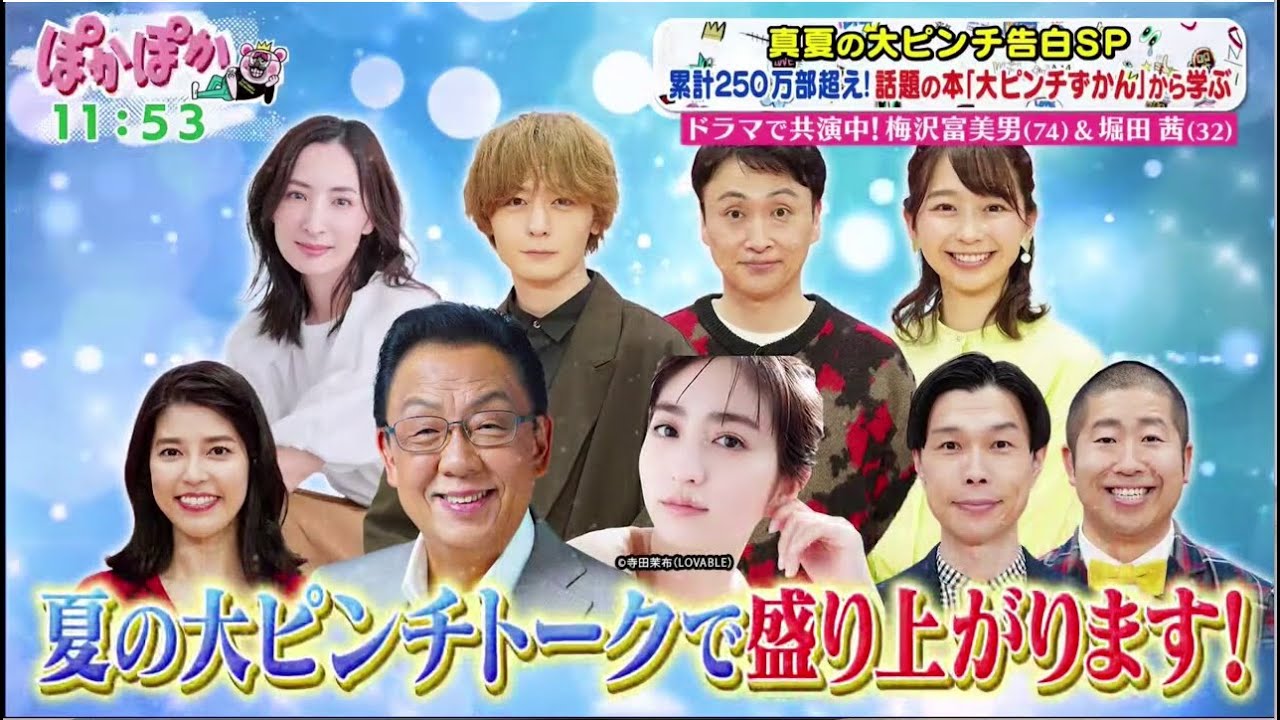 と挨拶ポカポカ。 こんにちは。どうもあります。 さあ、始まりました。僕コも僕金曜日です。皆さんよろしくお願いします。 いや、ありがたい。 ありがとうございます。 ありがとうございますね。お元気そうで皆さんね。 ね、梅沢さんの苦顔上手ですね。 て書いてますよ。 あ、 似てらっしゃる。 うまいです。いいですね。 その横の う サーベラブも サーベラブもね、 いいですよ。 めましたよね。そうです。 サブやっぱ人気が怖かってきてんでしょうね。おらく者の大体ね、あの今日プリントしたみたいなのペラさのねやみんな みんなあのタイプですよね。 みんなあのタイプです。ペラペラのね。 でも気が上がってきてんでしょうね。て言ったら持ってる人がなんかグぐみたいなグブグって言ってましたけどね。 え、本日は中梅沢さんさんをお迎えしまして累計 250 万話題のベストセラーから学ぶマ夏の大ピンチスペシャル。 イエー。 お、 大ピン図鑑ね。 大ピン地図面白いよね。 めちゃくちゃ人気なん家にも 面白い。あるあるだからね。 静かねから学ぶっていうことみたいです。皆さ いで皆さんありますもんね。ピンチんな種類のね。はい。色々お話ししていきましょう。 まずは金曜レギュラーの皆さんです。どうぞ。金曜ギュラー犬こじのお 2人。そして パセさん。 金曜日小室穴お願いします。 よろしくお願いいたします。 さあ、改めまして本日のトークテーマこちらです。 今世間で大人気なのが幼少期に出会う様々な大ピンチを集めた自動書大ピンチ図鑑 一応子供 足が見つからない 紙パックのストローが取れる 幅広い世代が共感できるピンチをコミカルに描き シリーズの累計発数は 250万。 今年4 月に発売された大ピンチ図鑑半期の書籍売上総合第 1位。まさに大ピンチム。 そこで本日は浅草ラスボスおばあちゃんに出演中。梅沢おさんホ田赤さんと一緒に夏の大ピンチトークで盛り上がります。 ということで本日のゲスト梅沢富さん赤さんです。 どうぞどうぞどうぞよろしくお願いします。あ、どうも。どうも。 上澤さんはもう 3回目なんです。 そうですよ。好きですね。ボカボカ好きなんです。 いやとか嫌いじゃなくてさ。なんで俺をレギュラーにしなかった?レギュラー。 にすると めんどくさいか。それめどくさい。 いやいや、いろんなチ。それはね、梅沢さん経験 そうですよね。 たくさんあの経験してますね。 そうですよね。 ほったさん初めて全部よろしく。 ありがとうございます。 はい。 こんなドラマで はい。 共演中で はい。 はい。 こんな可愛いことドラマはやらしい。 ま、それ嬉しい。 嬉しいに決まってんじゃないの?うちの周りはバっかりじゃ。そんなことねえしょ、別に。 ほら、 梅田さん、どうすか?現場でほったさん。 はい。めちゃくちゃ優しいしすごい差し入れしてください。 差し入れ。 そうなんだ。 何を差し入れするんすか? 何を皆さんがお腹空いた、小腹鼻が空いたなというもの差し入れたり、い、あるちゃんがちょっと今日水分足んないんじゃないかなと思ったら アイスコーヒーの。 いや、そうなんですよ。 へえ。入れ。 その日の状況に応じて一番いい差し入れをくださって 今日ポカポカに差し入れはなかった。 あるわけねえだろ。だっくれてもいいです。 なんで今コスさんあんな怒られた?な さいことで皆さん席の方へお願いいたします。 よろしくお願いいたします。 大ピンチ図鑑ね。 なんかピンチを 皆さんのピンチを色々ちょっと今日は伺ってくれる。 はい。 ということでまずは梅沢さんの大ピンチから行きましょう。こちら 10億円の借金でした。すごい出 今日はマックス。 これ以上で出ない。 いやいや、だんだんエスカル 10億以上です。以 上桃鉄の話ですか?梅 もっと深刻な話ですよ。 深刻な、 あの、今から12年ぐらい前かな 兄貴が騙されたってことが発覚してね。 あ、そうですね。 ま、芸能人だから、あいつ舞台にほら仕事しかしたことない人だ。 で、全て劇団の運営って兄貴に任しちゃったんだね。 あ、え。 うん。だ、座長だから。 うん。 で、兄貴が信頼してた書にすっかり騙されて、 あ、そのお兄さんもまた別の方にちょっとけるというか、お 金の管理お願いしちゃった。 お願いしちゃった。 うちの亡くなった兄貴にはお金管理ができなかったけどね。 ま、兄貴が信頼してたんならいいだろうっていうことで 任せようっていう。 で、ま、アタ開けてみたらなんとあんた 15近く借金があって うええ え。それどうどういうことですか?どう使われちゃってたってこと? そう。お金を全部うまいことこう回しながらお金全部取られちゃって。 ええ、 で、銀行からの仮入れて運営してたみたいなね。 ああ、なるほど。 うん。ところがそれをほら分かった時にはもう相手はいないしさ。は、 うわ、 飛んじゃった。なくなっちゃっかばしちゃったんで。 え、それ捕まらないんですか? いやいやいや、それは捕まえた。しょうがないから。ほら、兄貴