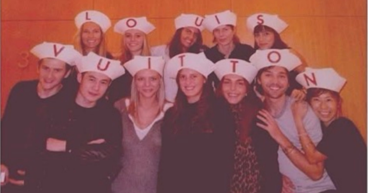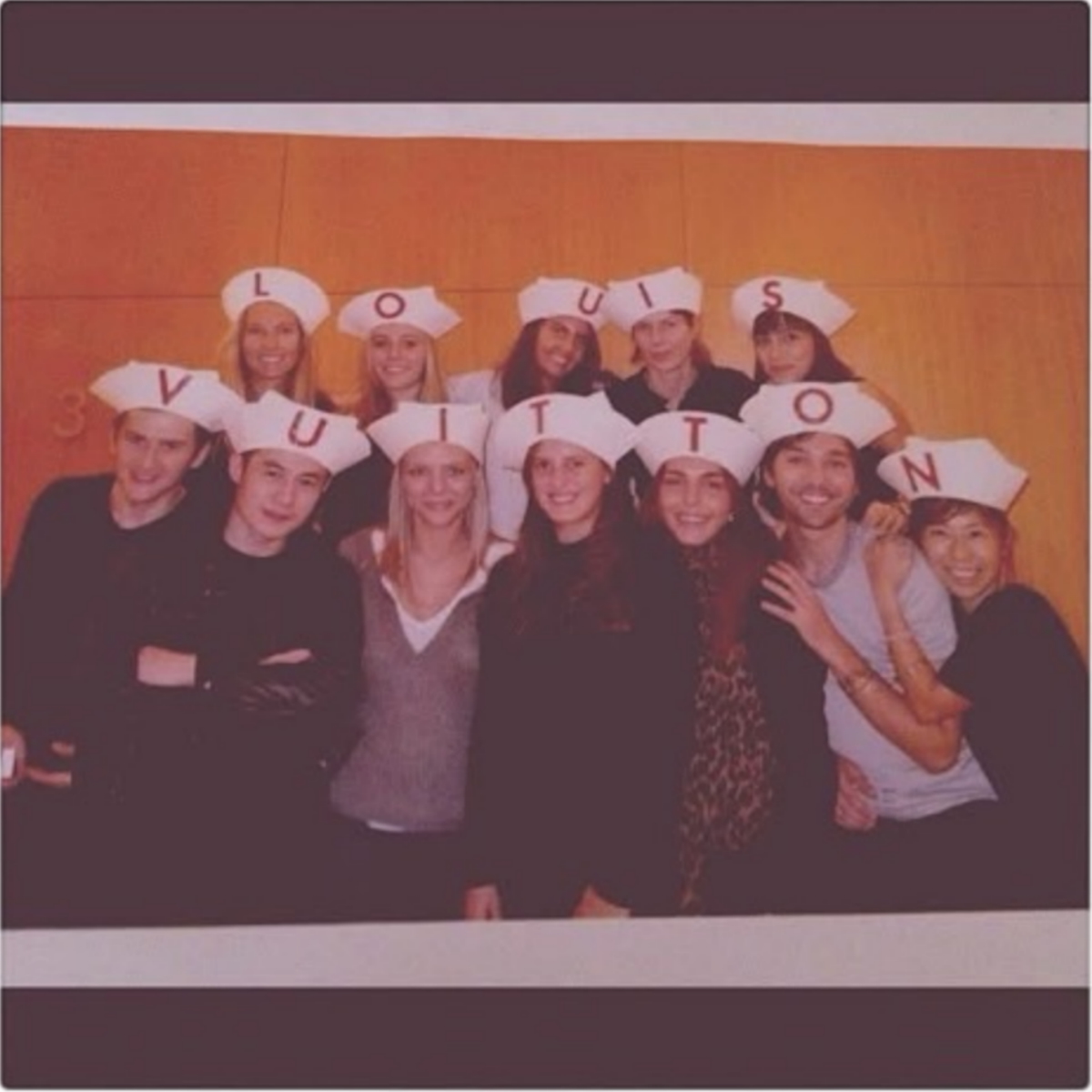 「ルイ・ヴィトン」パリのショー後に、ショーピースだった帽子をかぶってPRチームと記念撮影