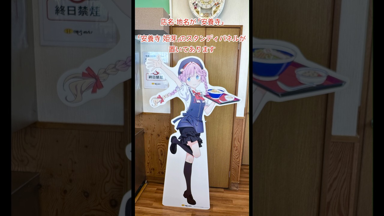 店名・地名と同じ「安養寺」が名前に入っているキャラクター「安養寺姫芽」のスタンディパネルが置いてあります。